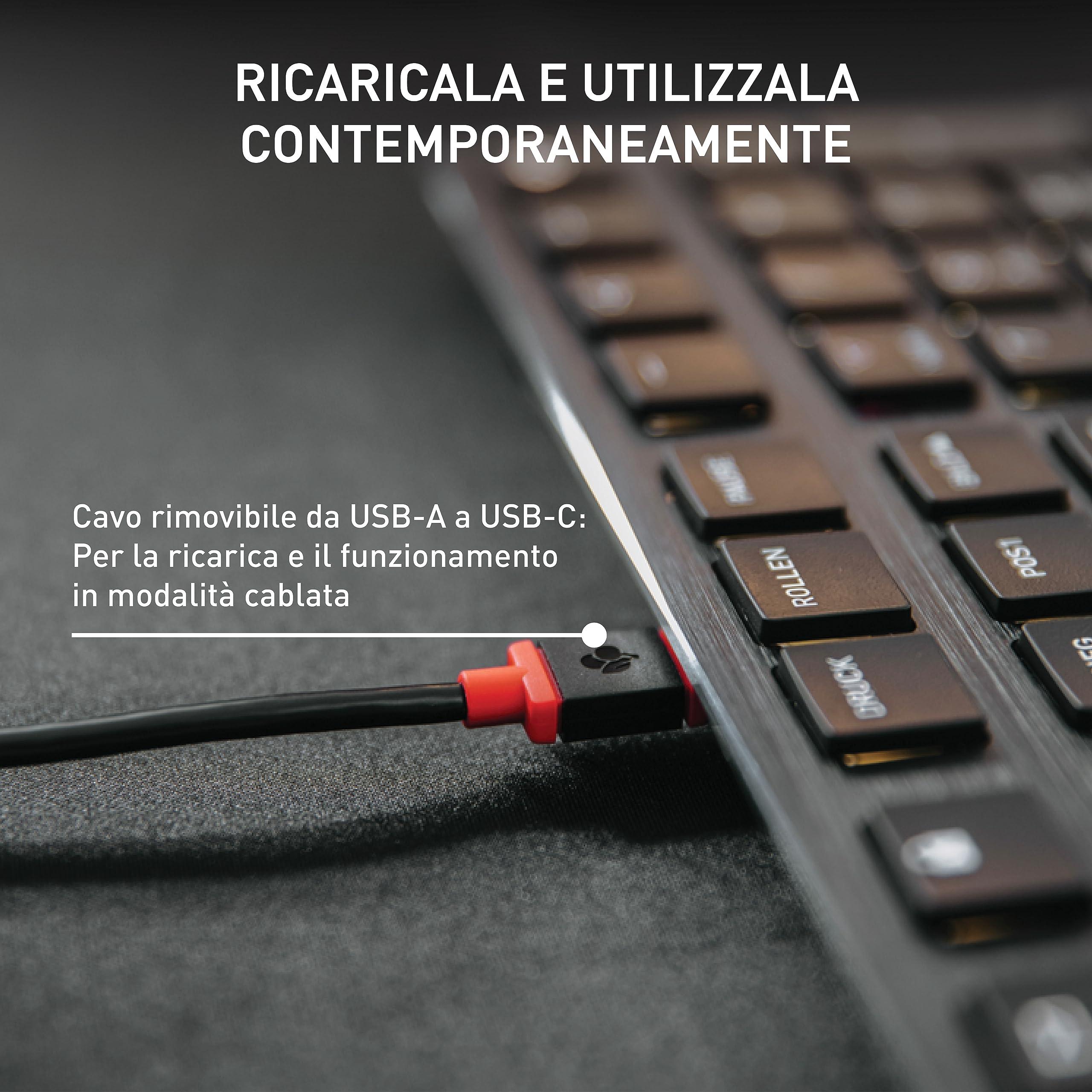 - Ricaricabile: cavo removibile da USB-A a USB-C per la ricarica e il funzionamento in modalità cablata (la tastiera è facilmente ricaricabile anche durante il funzionamento)