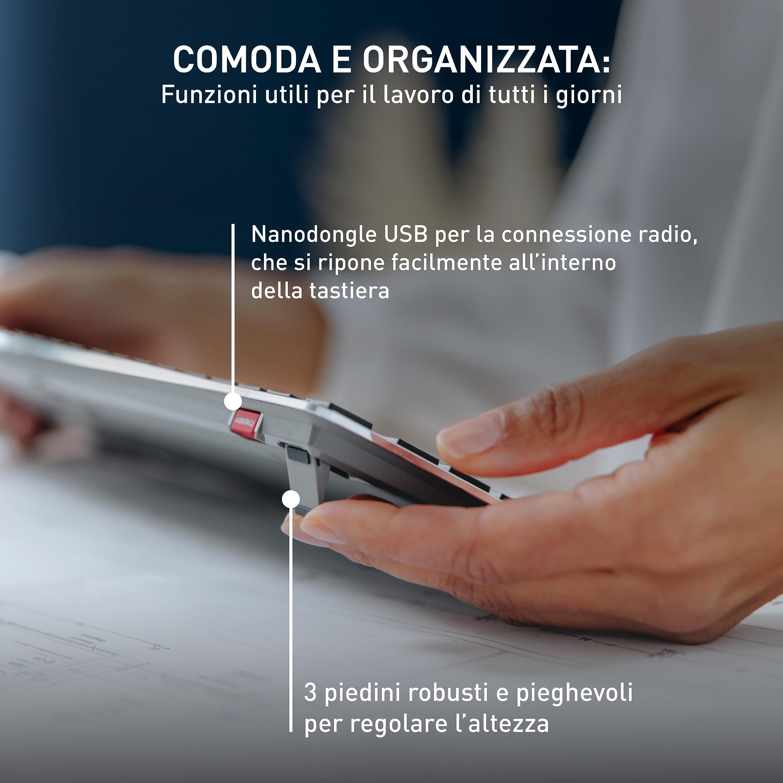 - Tastiera multidispositivo per fino a 4 dispositivi diversi: due canali Bluetooth 5.2, un canale wireless a 2,4 GHz (ciascuno con crittografia sicura AES-128) e una canalina per cavi