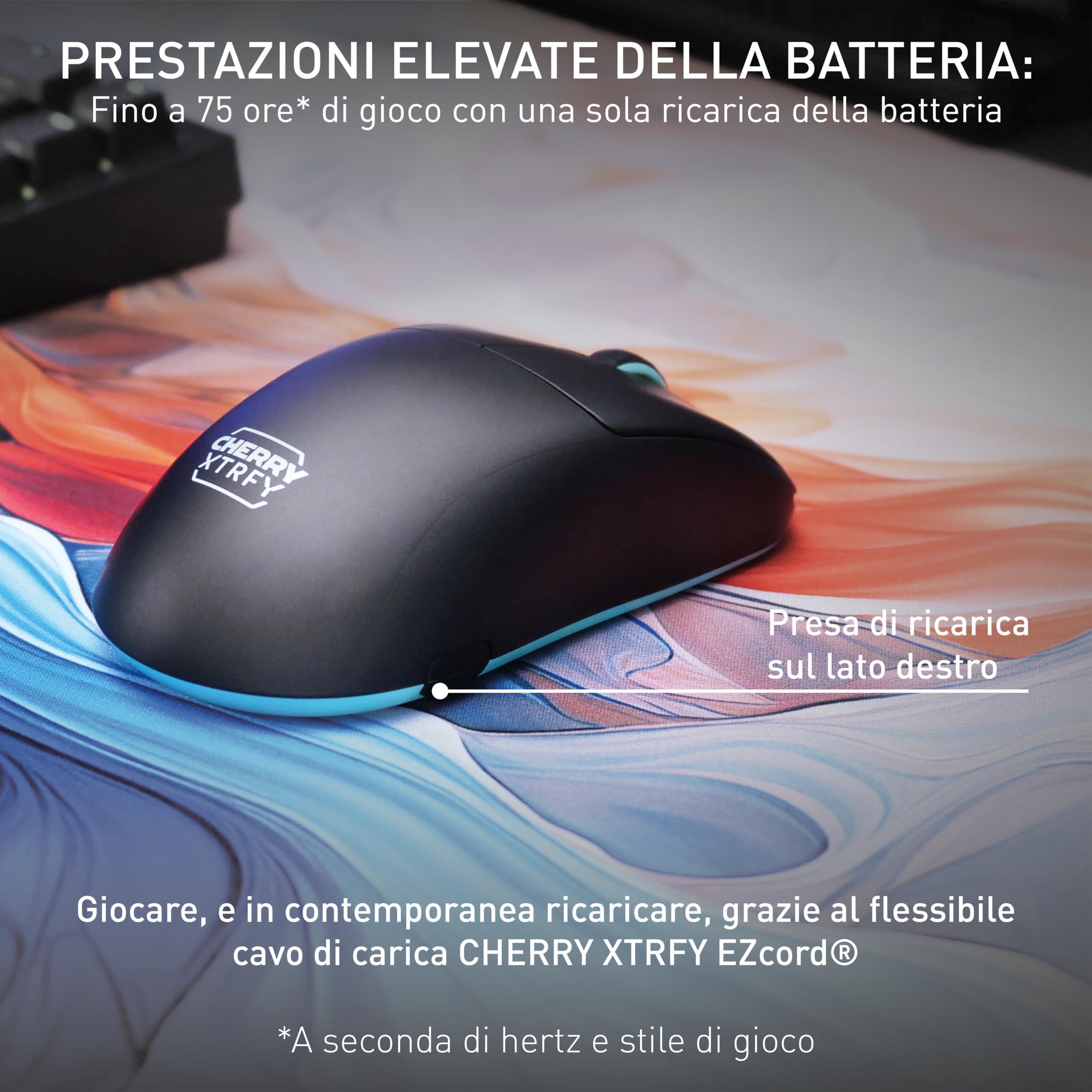 - Ricaricabile: A seconda della frequenza e dello stile di gioco, una carica dura fino a 75 ore. Durante la ricarica, puoi continuare a giocare senza interruzioni grazie al cavo di ricarica flessibile CHERRY XTRFY EZcord