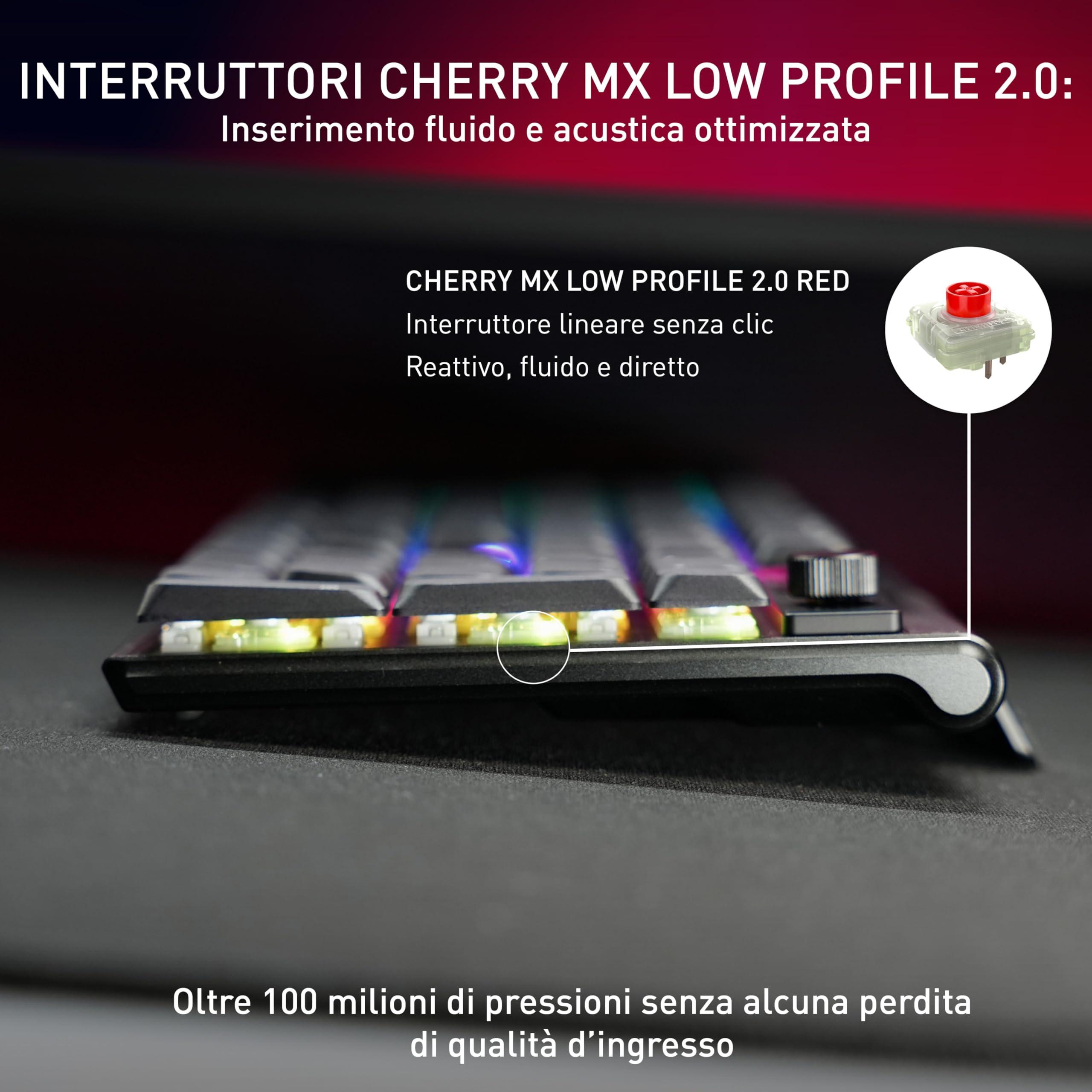 - Interruttore CHERRY MX LOW PROFILE 2.0 RED: sensazione di digitazione fluida e diretta con caratteristiche di commutazione lineari (nessun click) e più di 100 milioni di attuazioni per tasto
