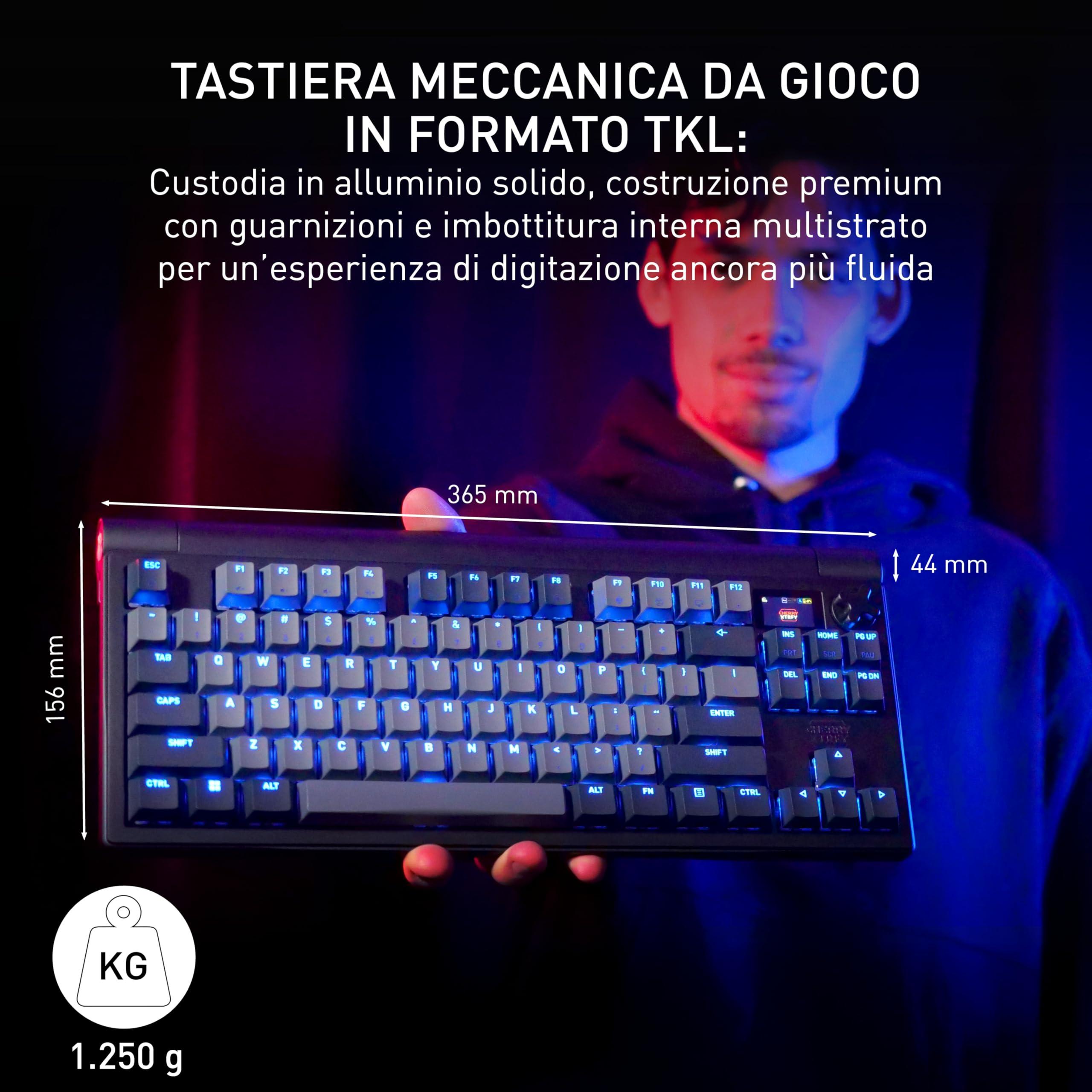 - Ultraveloce: polling rate di 4000 Hz in modalità wireless e di 8000 Hz in modalità cablata. Il display mostra la velocità di digitazione (APM) e lo stato della batteria (incl. 3 profili personali)