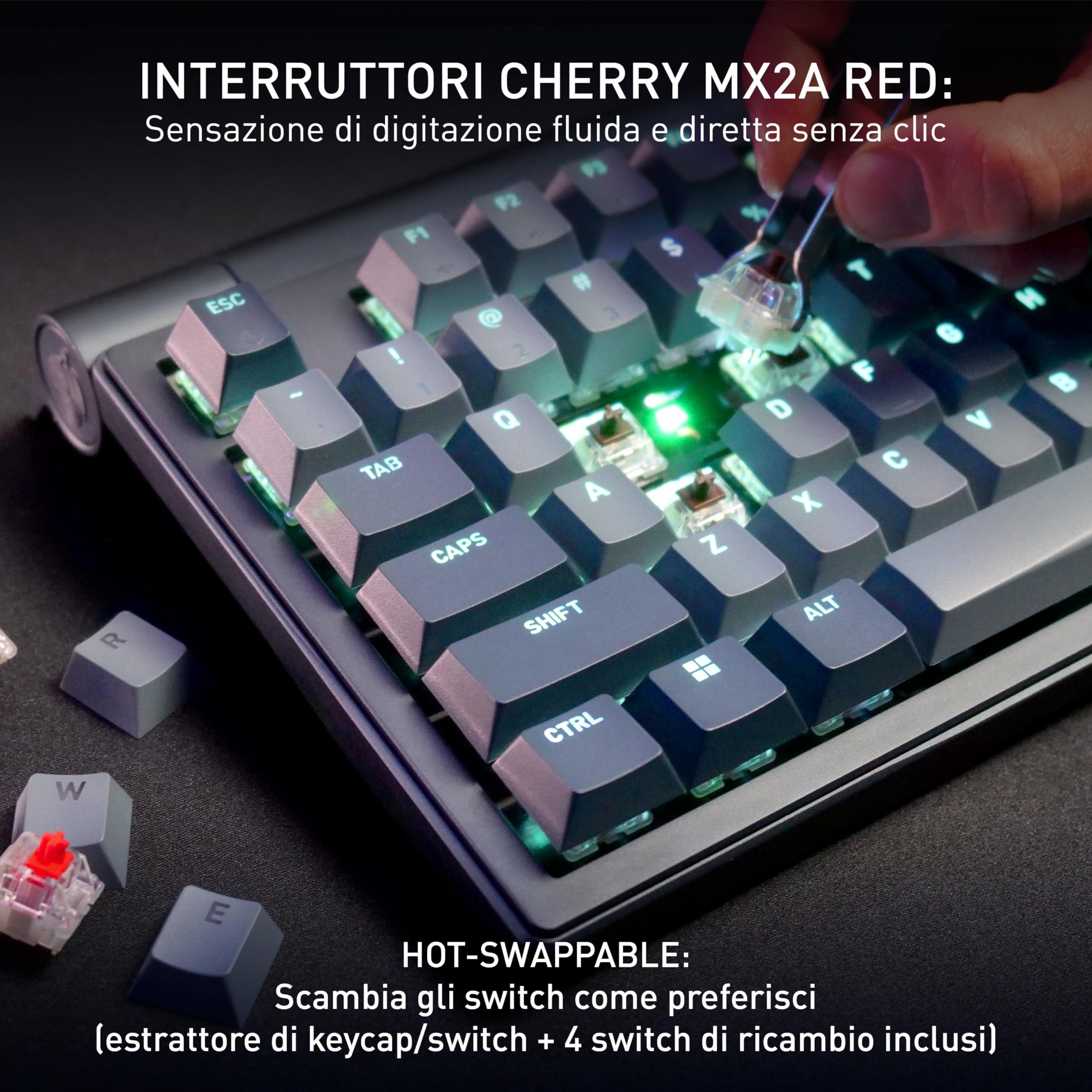 - Interruttori meccanici CHERRY MX2A RED hot-swap: sensazione di digitazione fluida e diretta con caratteristiche di commutazione lineari (nessun click) e più di 100 milioni di attuazioni per tasto
