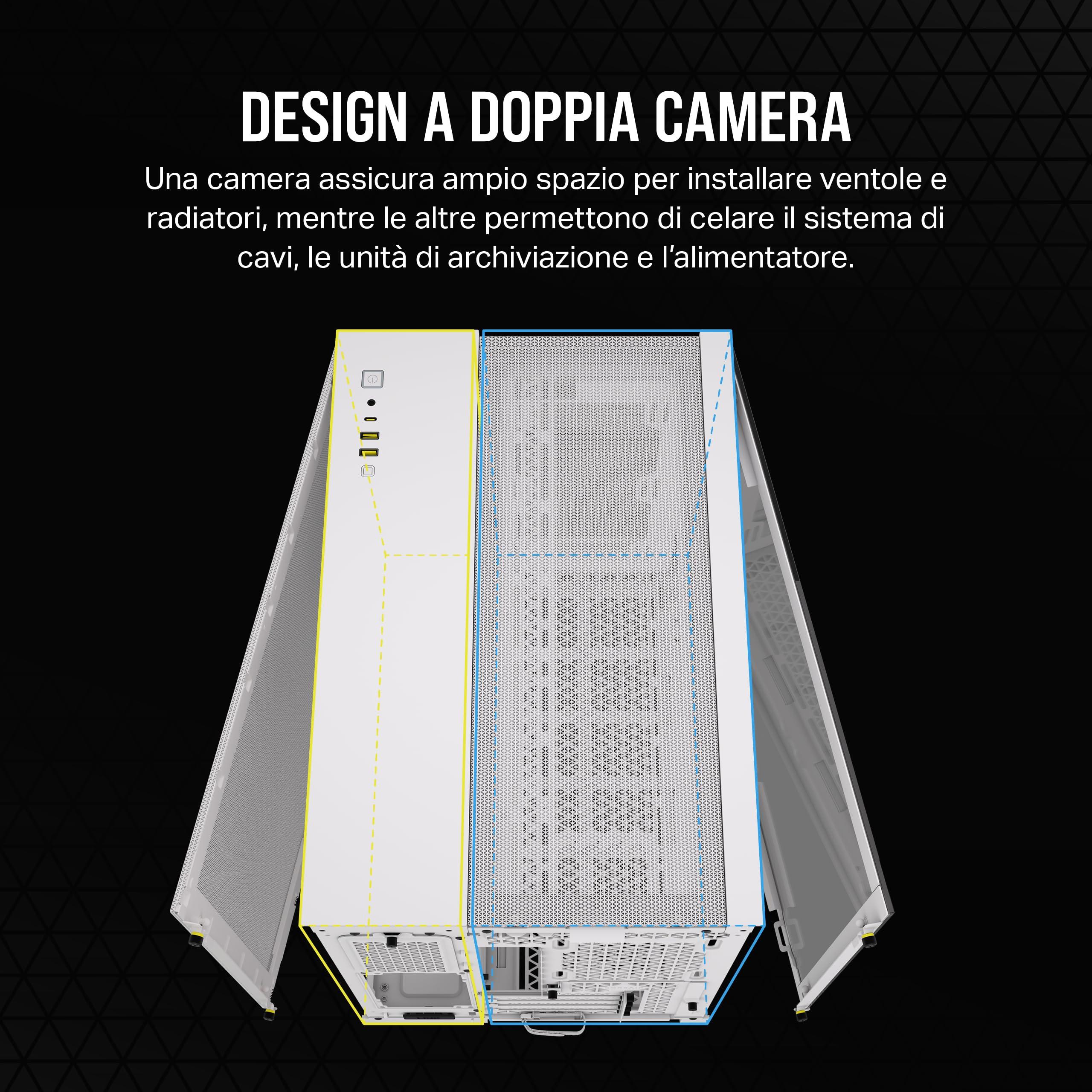 - Design a doppia camera: Promuove un raffreddamento efficace e una costruzione più pulita e organizzata, con una camera dotata di numerosi supporti per ventole e radiatori e l'altra che offre spazio in abbondanza per il passaggio dei cavi, l'alloggiamento delle unità e l'installazione dell'alimentatore.