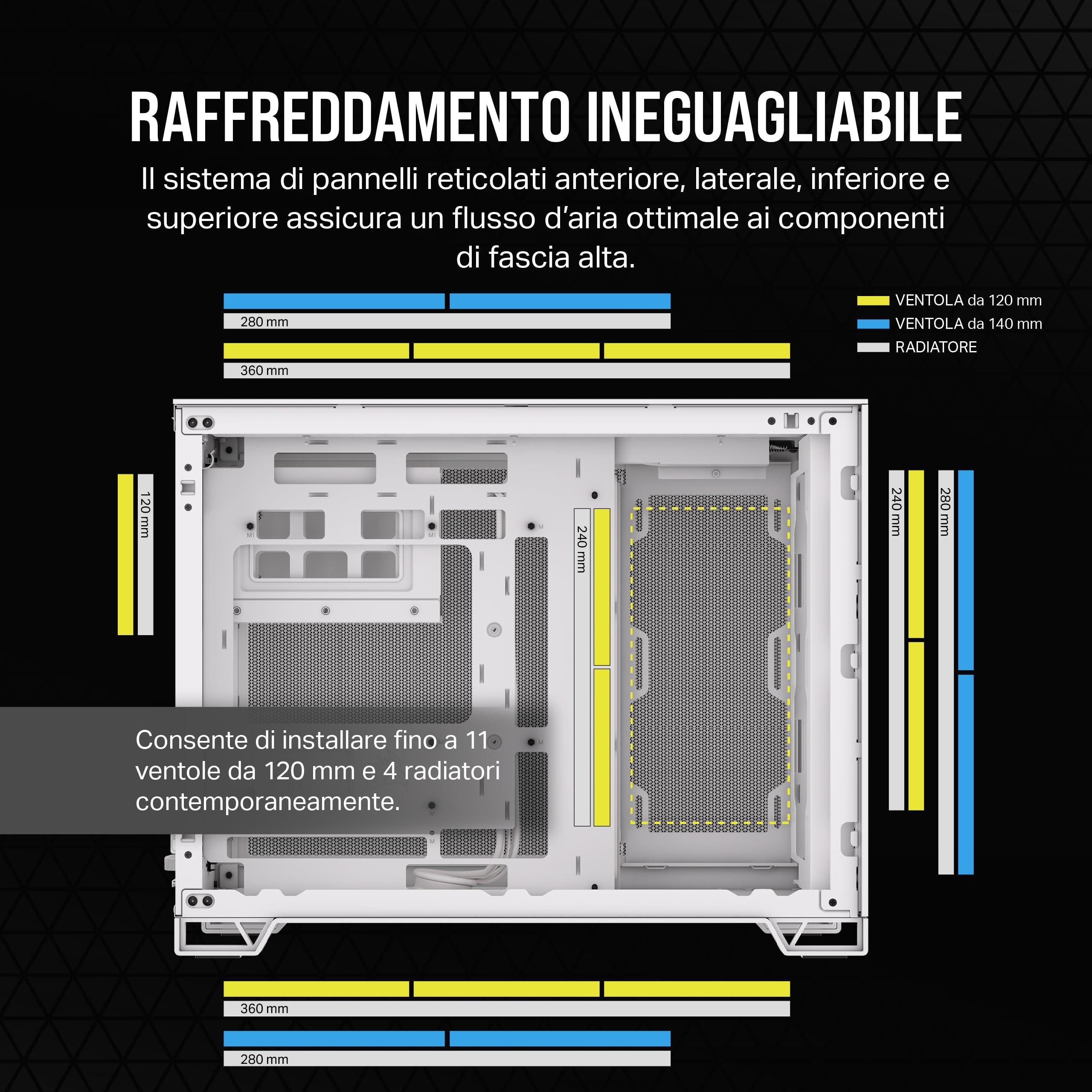 - Opzioni di raffreddamento ad ampio raggio: Ottimizzate il raffreddamento con spazio per 11 ventole da 120 mm o 6 ventole da 140 mm, comprese le versatili opzioni di montaggio del radiatore fino a 360 mm nel tetto e nella parte inferiore e spazio per 240 mm sul lato e sulla parte anteriore