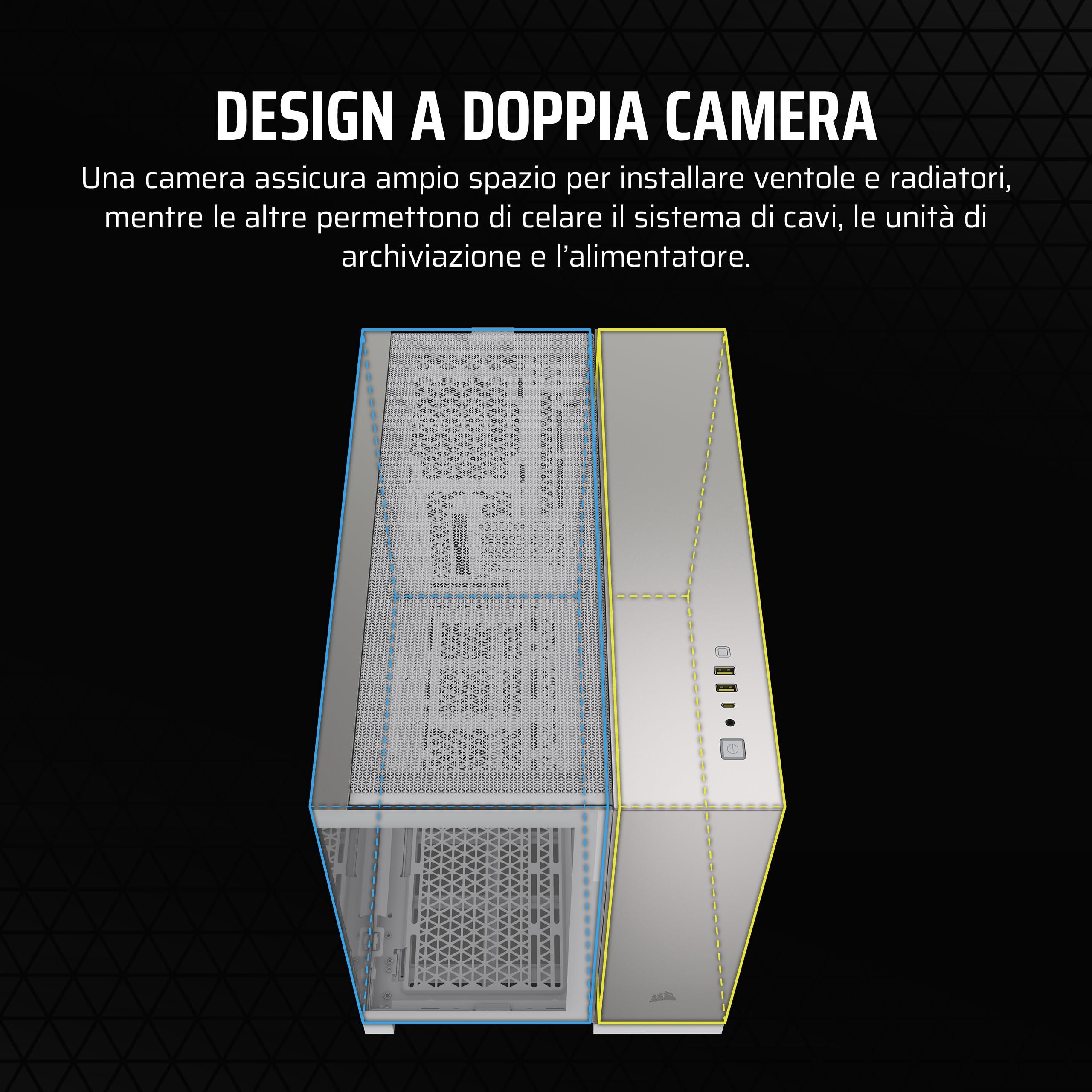 - Design a doppia camera: Promuove un raffreddamento efficace e una costruzione più pulita e organizzata, con una camera dotata di numerosi supporti per ventole e radiatori e l'altra che offre spazio in abbondanza per il passaggio dei cavi, l'alloggiamento delle unità e l'installazione dell'alimentatore.