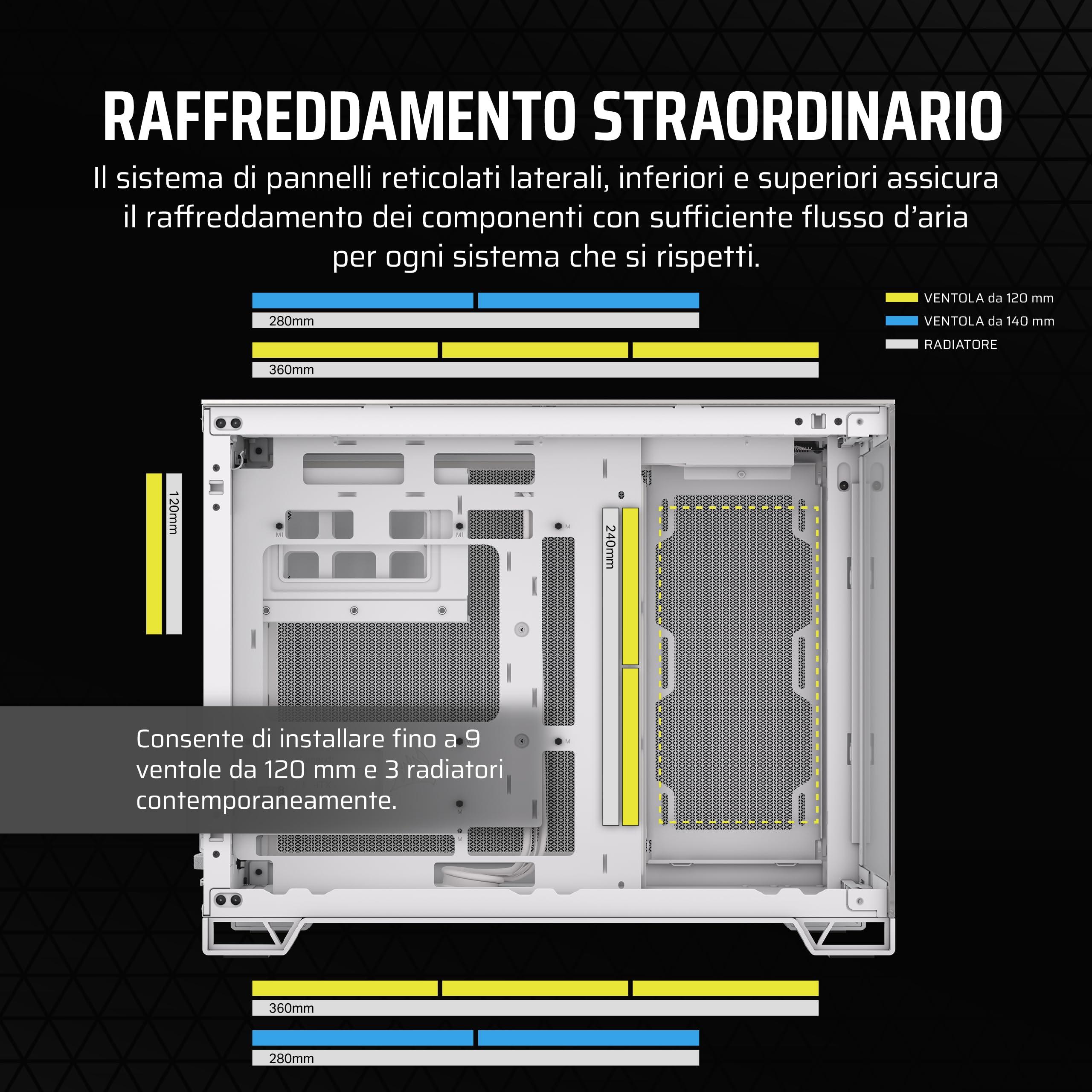 - Opzioni di raffreddamento ad ampio raggio: Ottimizzate il raffreddamento con spazio per 9 ventole da 120 mm o 4 da 140 mm, comprese le versatili posizioni di montaggio del radiatore fino a 360 mm sul tetto e sul fondo e spazio per 240 mm sul lato.