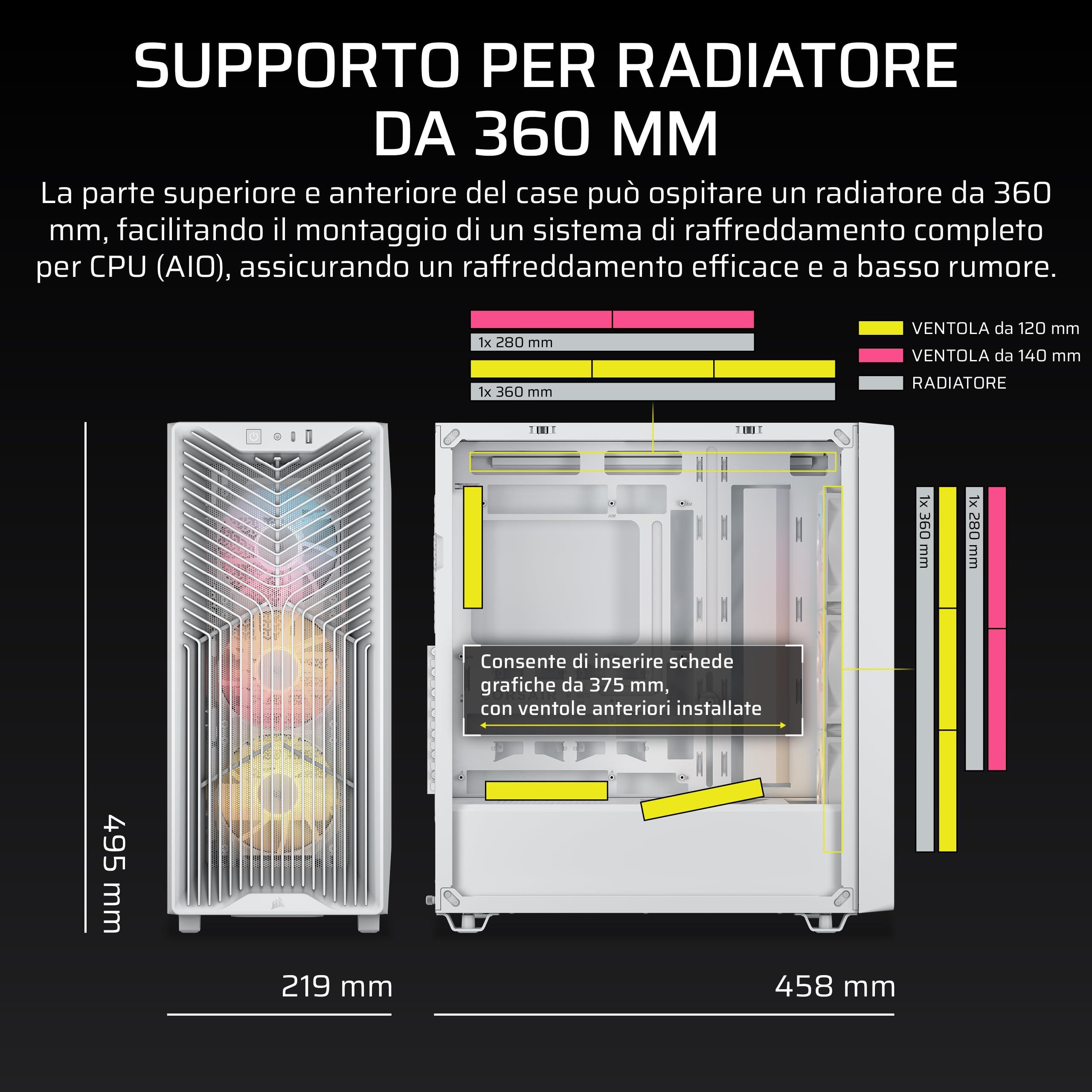 - Radiatore da 360 mm sulla parte superiore: raffredda le CPU più potenti con un radiatore da 360 mm montato sulla parte superiore per un raffreddamento efficiente del sistema