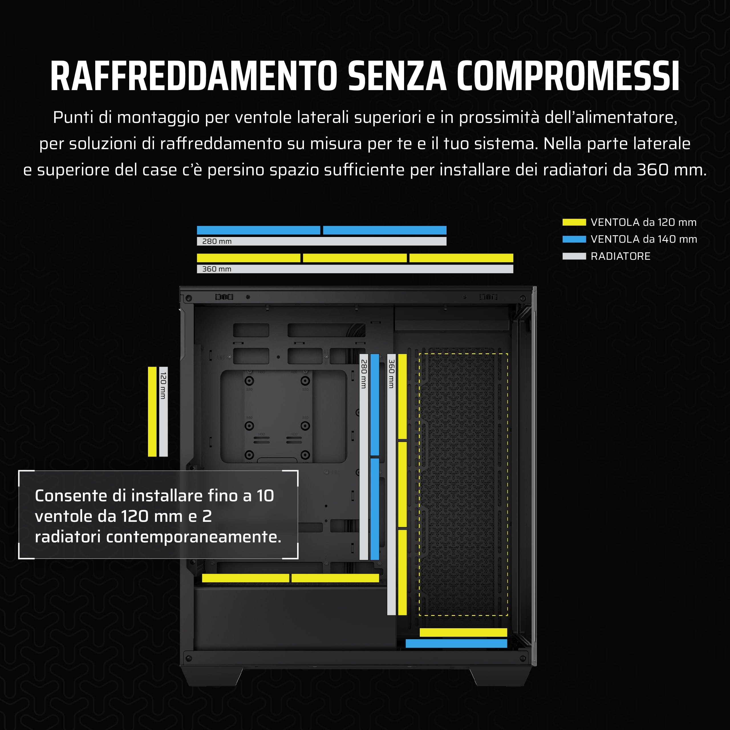 - Capacità di raffreddamento estreme: I punti di montaggio per ventole laterali, superiori ed in prossimità dell’alimentatore, che consentono di installare fino a 10 ventole da 120 mm, assicurano prestazioni di raffreddamento senza rinunciare ad uno splendido pannello anteriore in vetro