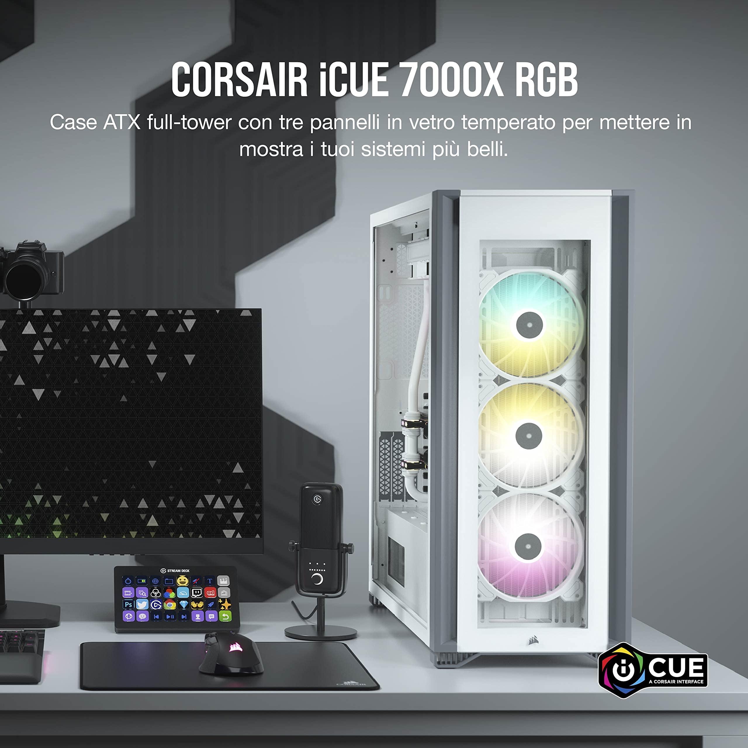 Corsair CC-9011227-WW, iCUE 7000X RGB Case per PC Intelligente ATX Full-Tower, Tre Pannelli in Vetro Temperato, Quattro Ventole RGB da 140 mm Incluse, Generoso Spazio Interno, Bianco