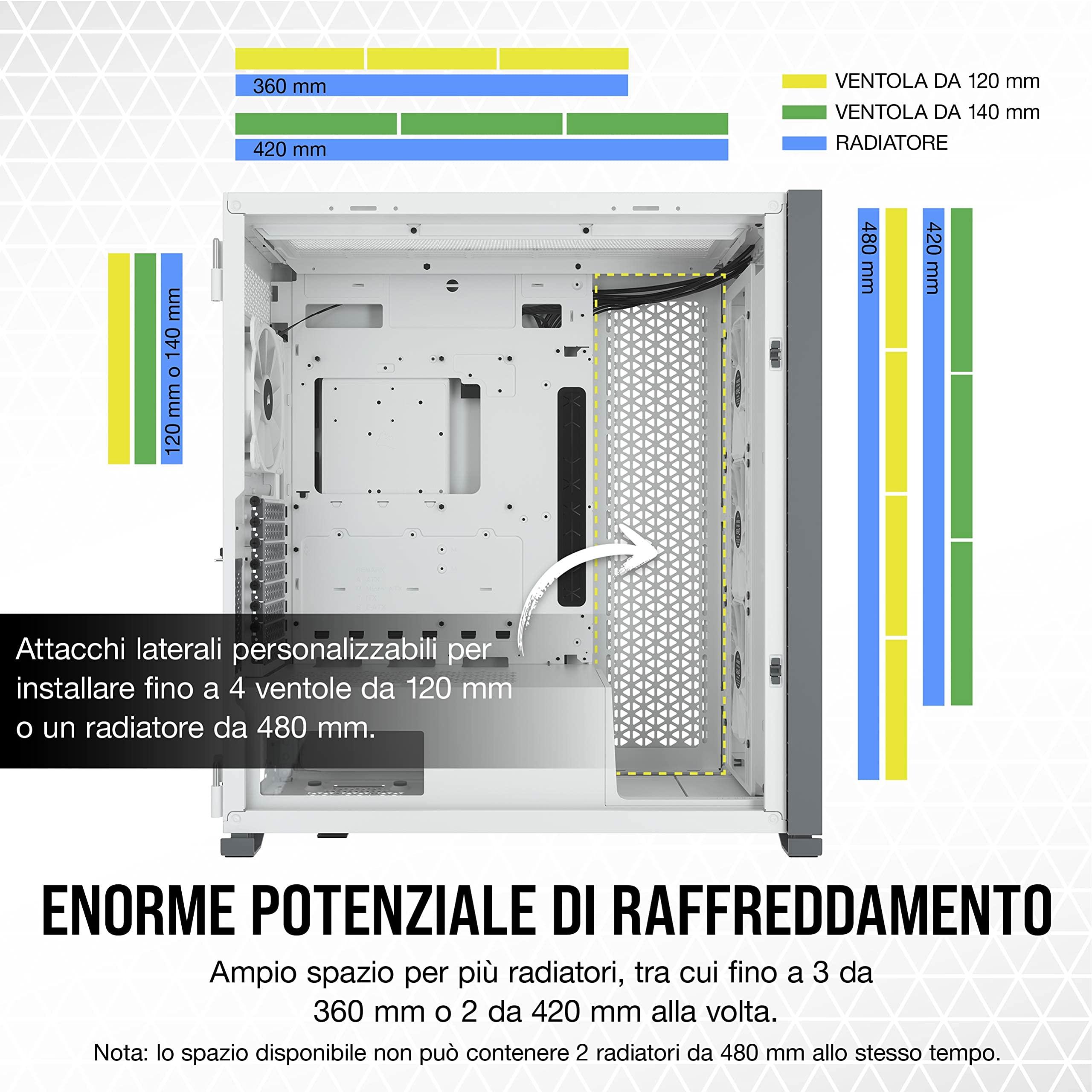 - Un raffreddamento glaciale: l'ampio spazio interno permette di montare fino a 12 ventole da 120 mm o 7 da 140 mm, oltre a più radiatori simultaneamente, tra cui 3 da 360 mm o 2 da 420 mm