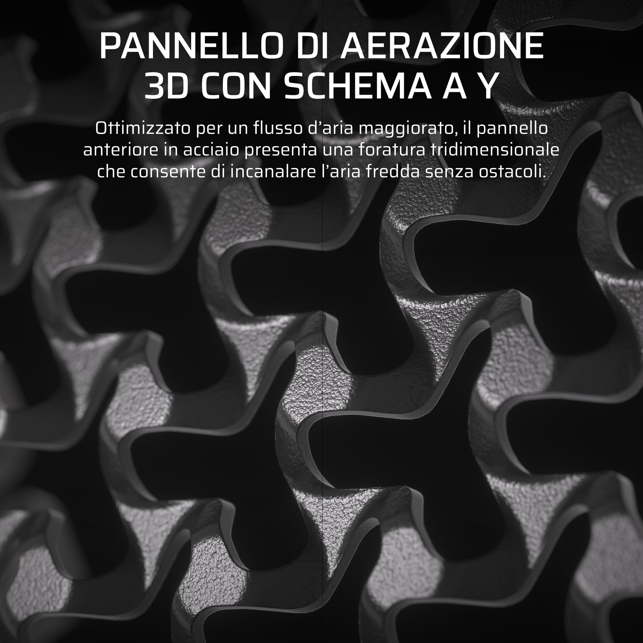 - Pannello del flusso d'aria a Y 3D - Ottimizzato per garantire un flusso d'aria elevato e una restrizione minima, il pannello frontale in acciaio è perforato in tre dimensioni con un motivo a Y che offre un percorso a bassa ostruzione per l'aria fredda