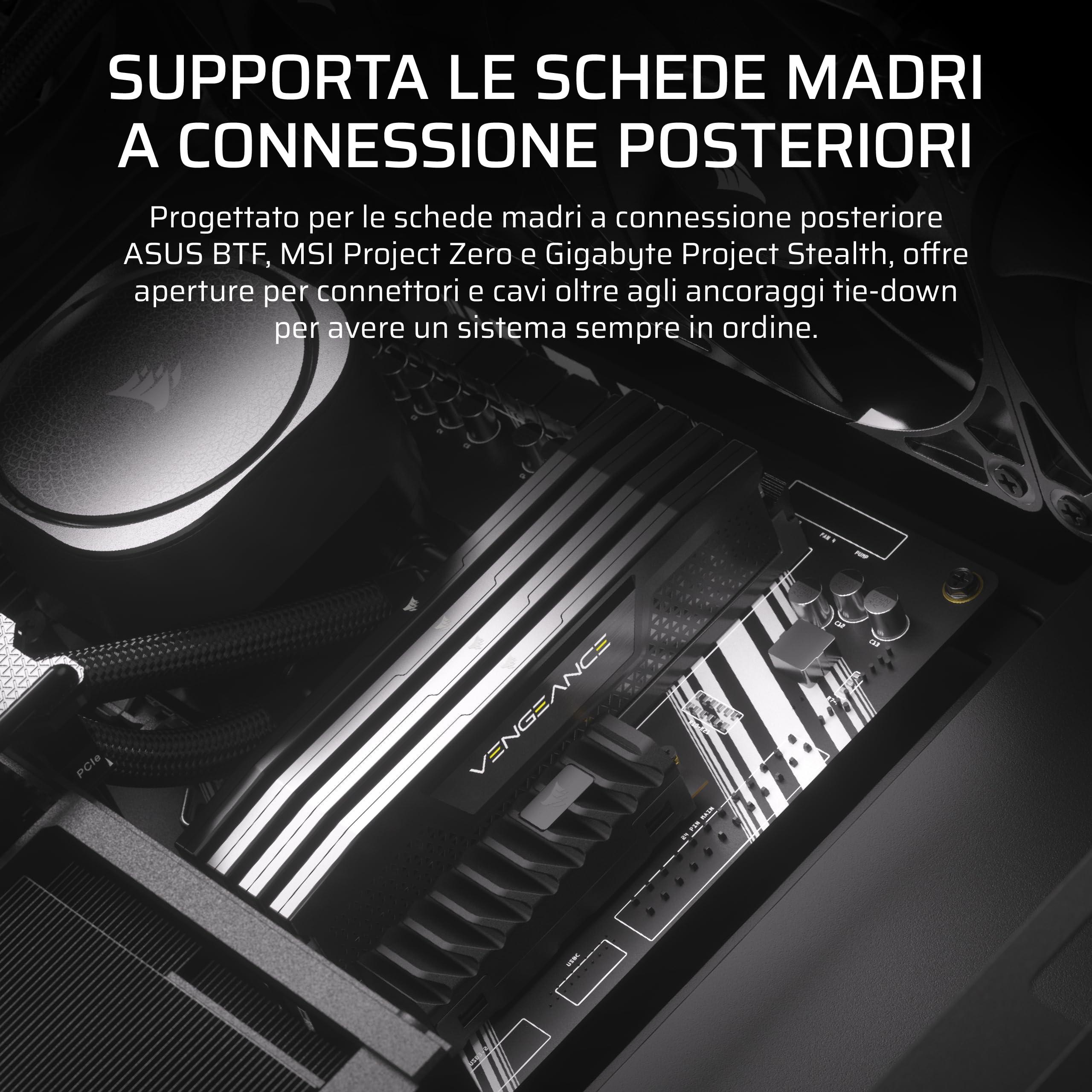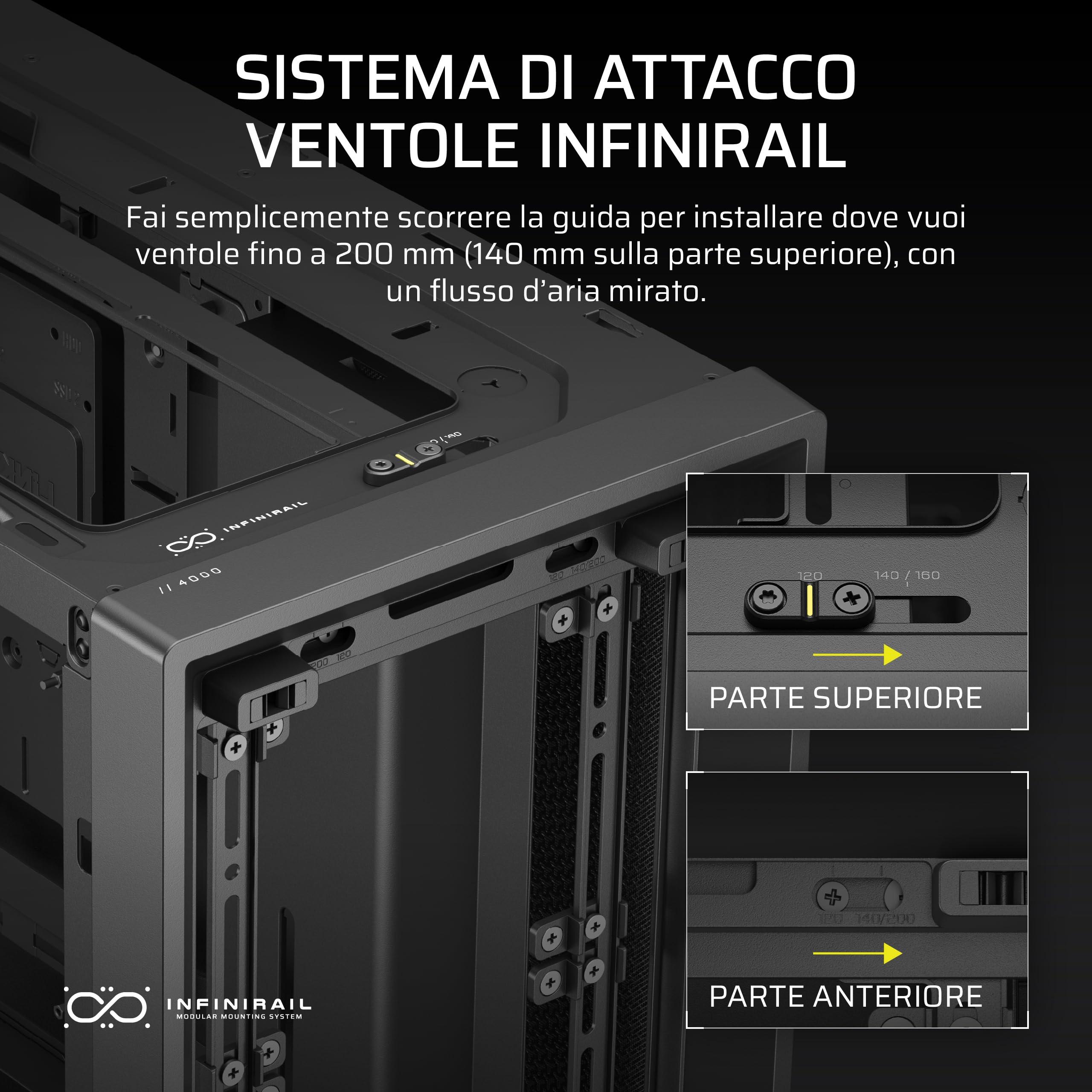 - Sistema di montaggio per ventole CORSAIR InfiniRail - Questo sistema di montaggio multi-punto in acciaio offre una flessibilità senza pari nella configurazione delle ventole anteriori e sul tetto. Basta far scorrere il binario per montare ventole fino a 200 mm (140 mm sul tetto) ovunque si desideri, garantendo un flusso d'aria mirato
