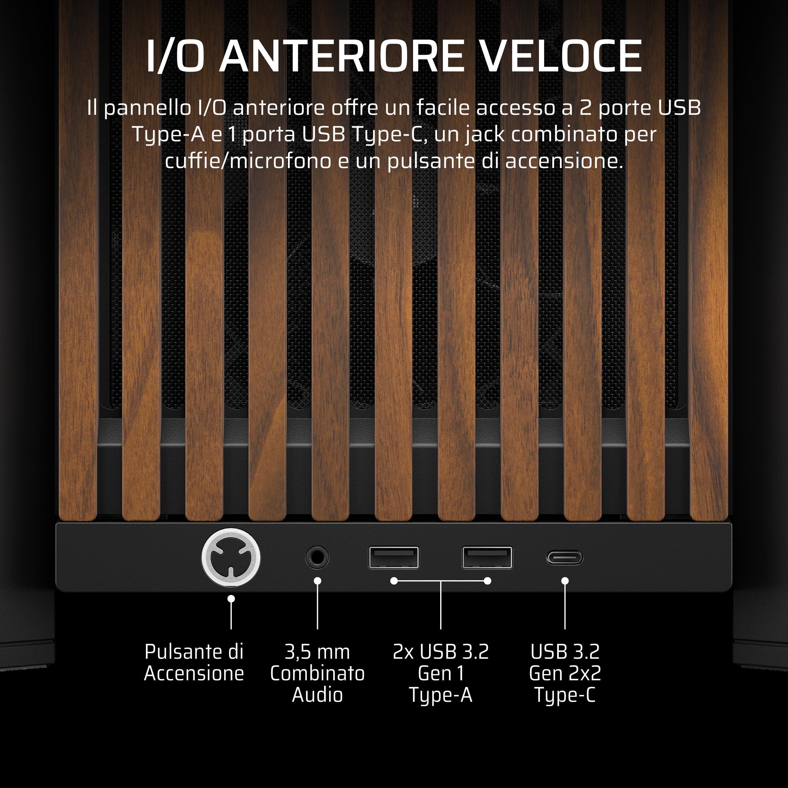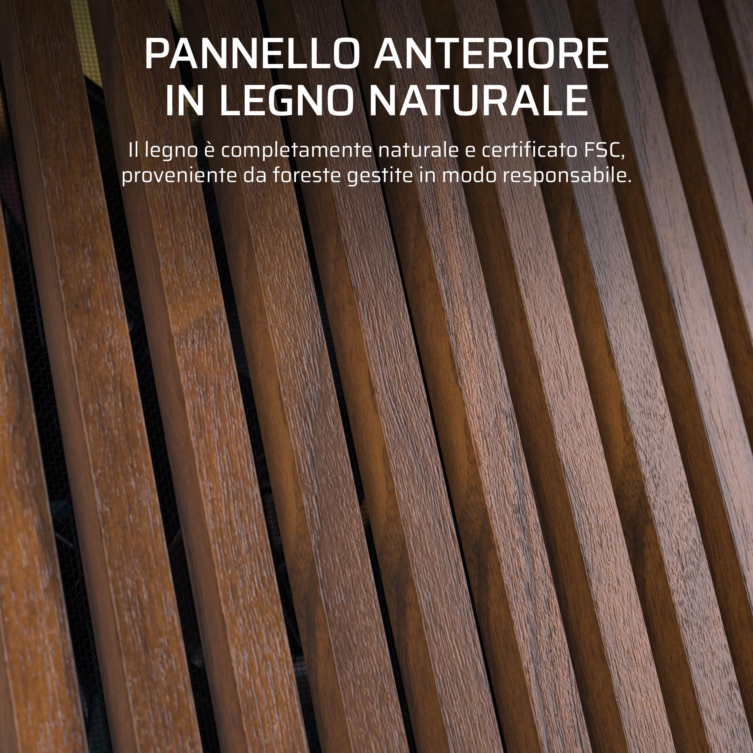 - Pannello frontale in legno: Il pannello frontale è caratterizzato da listelli in legno di quercia o noce certificati FSC per offrire un aspetto unico e un elevato flusso d'aria, garantendo un ottimo equilibrio tra estetica e prestazioni.