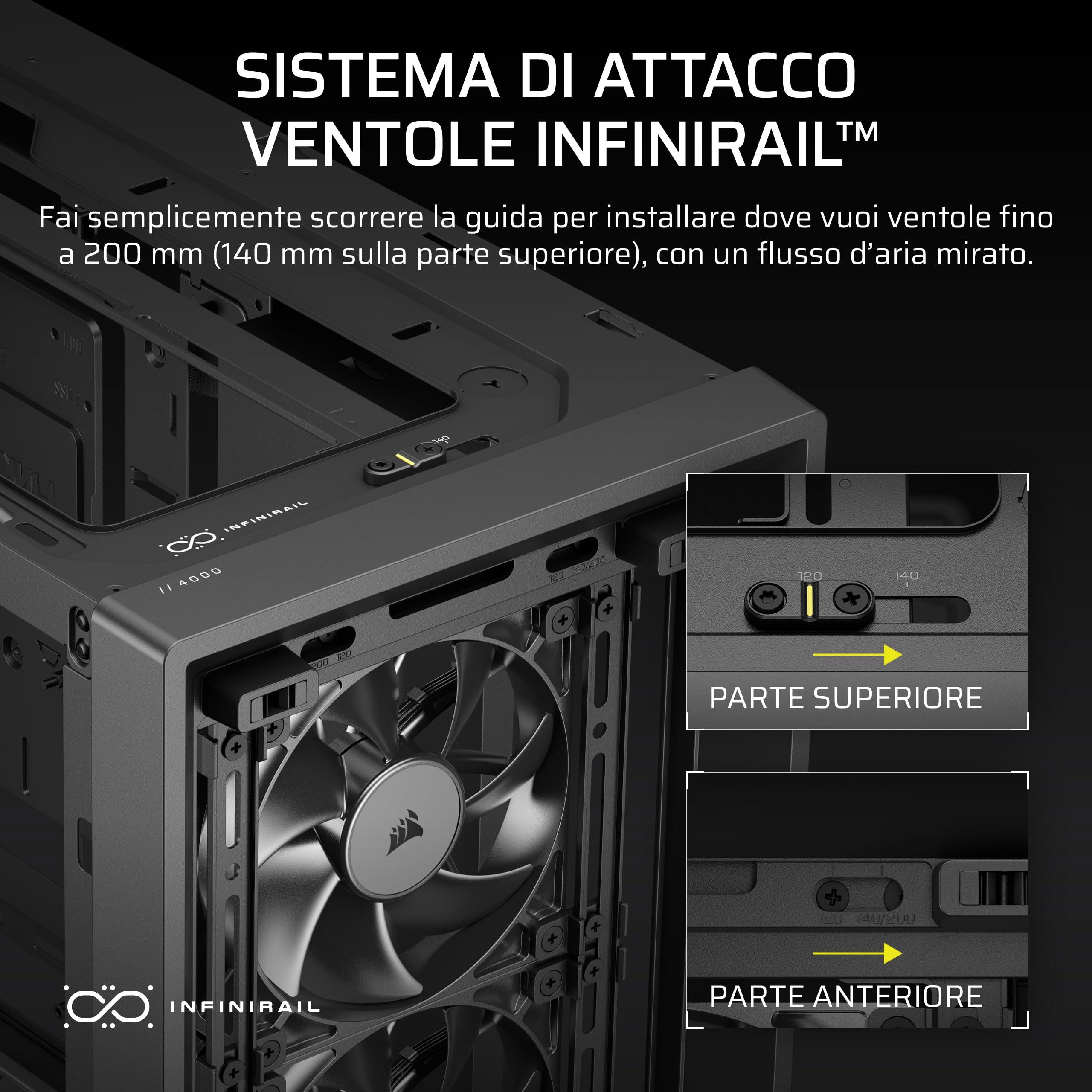 - Sistema di montaggio per ventola CORSAIR InfiniRail: Questo sistema di montaggio multipunto in acciaio offre una flessibilità senza pari nella configurazione della ventola anteriore e del tetto. Basta far scorrere la guida per montare ventole fino a 200 mm (140 mm nella parte superiore) dove si preferisce, garantendo un flusso d'aria mirato senza vincoli di montaggio fissi.