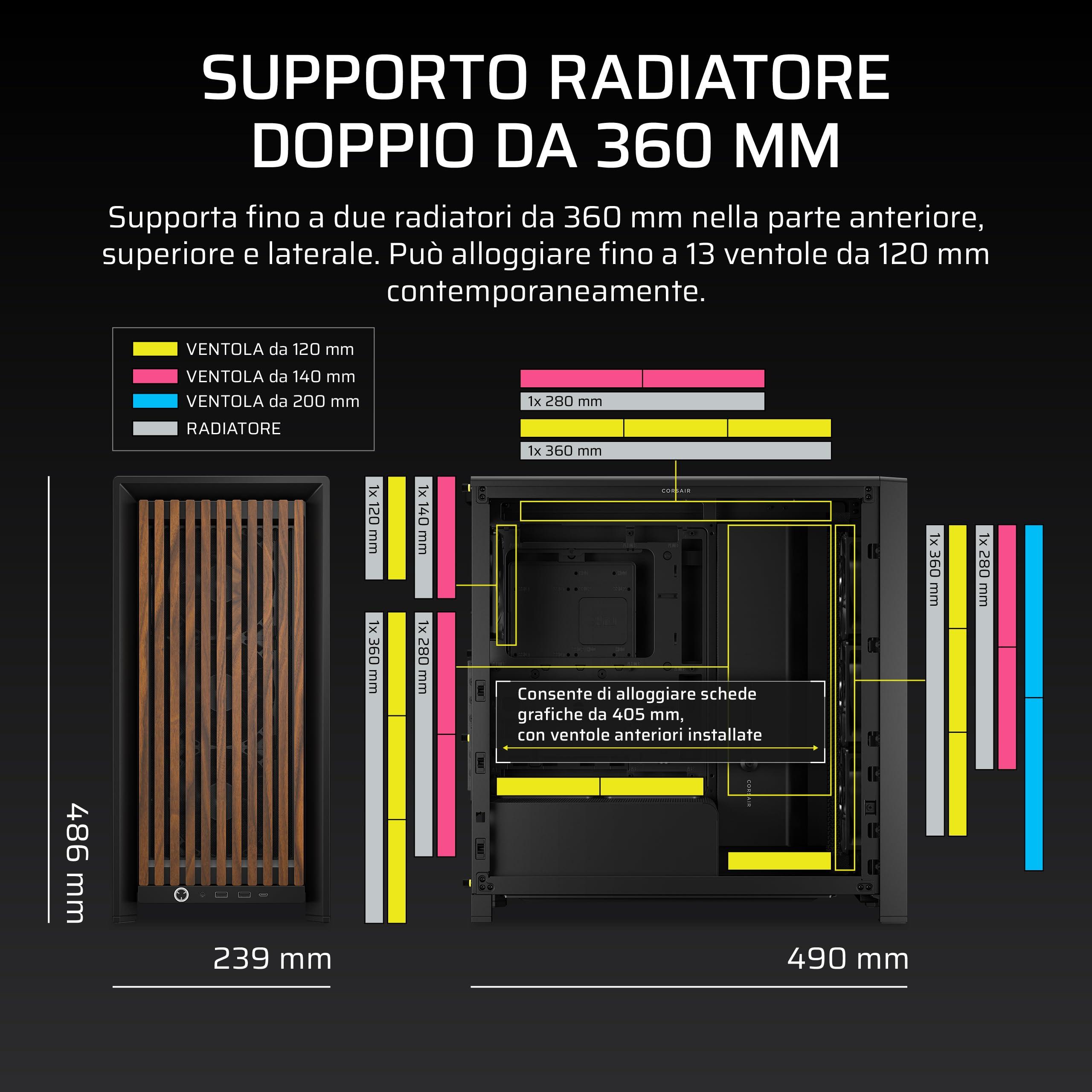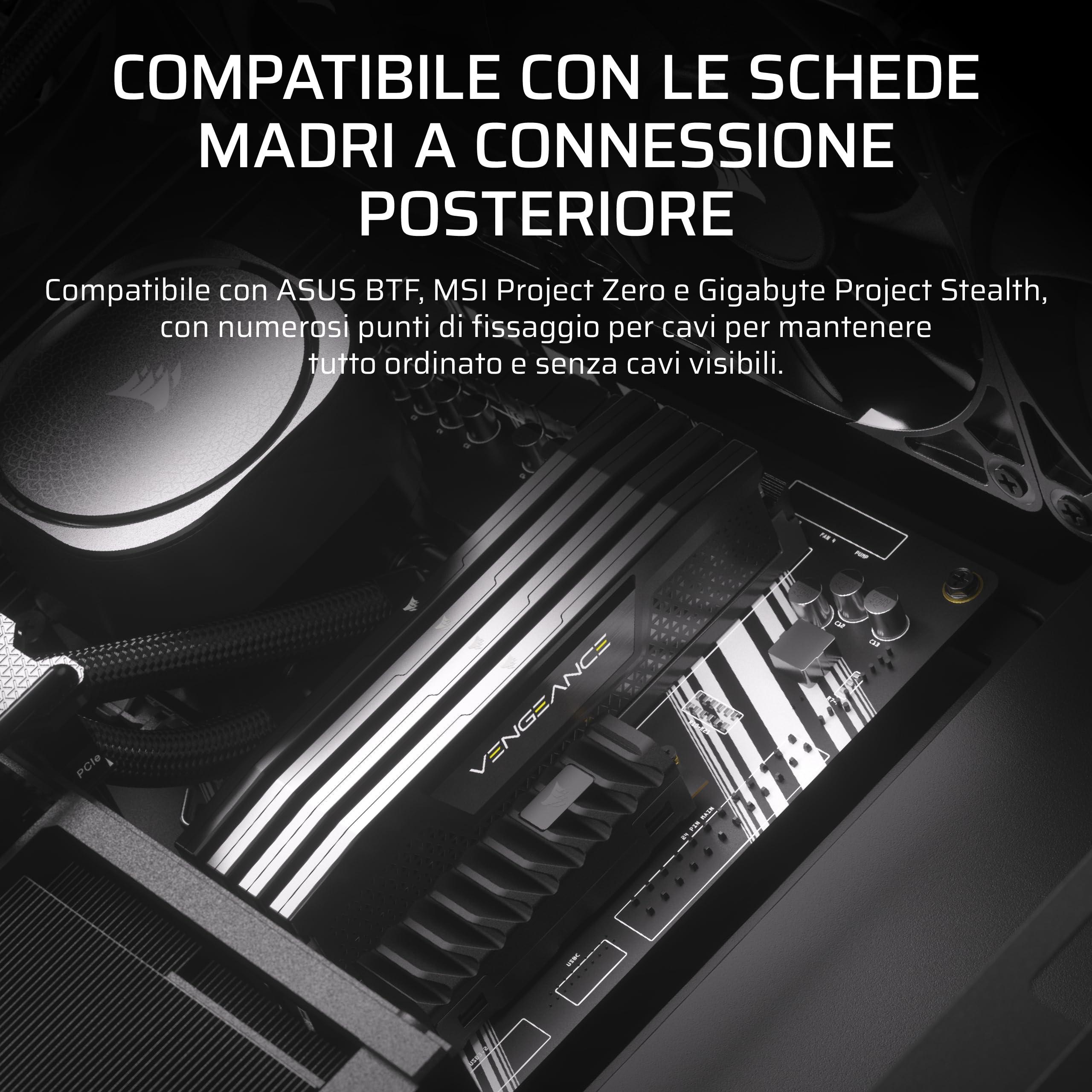 - 4 ventole CORSAIR RS120 PWM: Ventole ad alte prestazioni preinstallate nella parte anteriore e posteriore del case per un flusso d'aria ottimale attraverso il case e verso la parte posteriore, per un raffreddamento efficace e silenzioso. Le ventole utilizzano connessioni PWM a 4 pin collegabili in serie e supportano la modalità Zero RPM per un funzionamento pressoché silenzioso a bassi carichi.