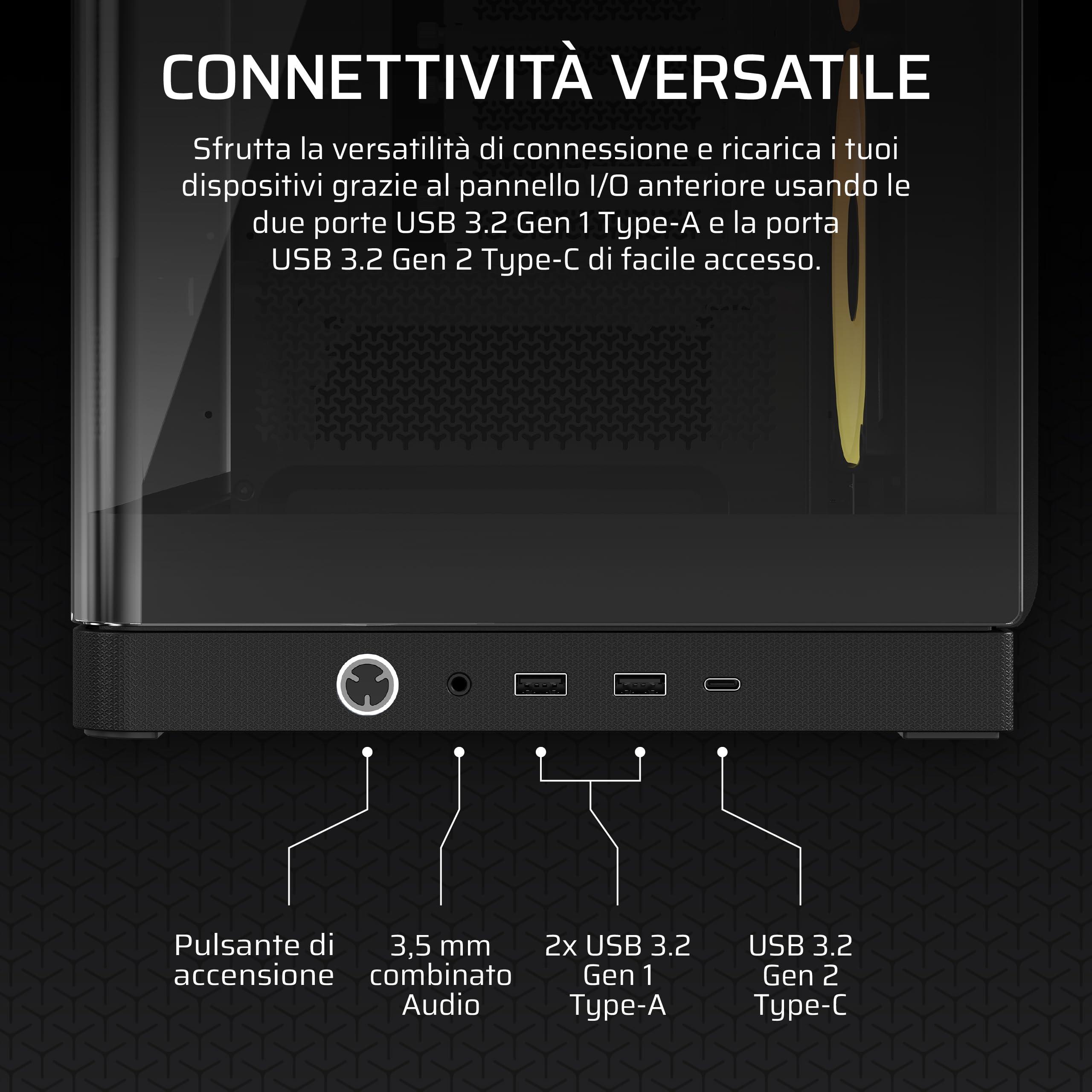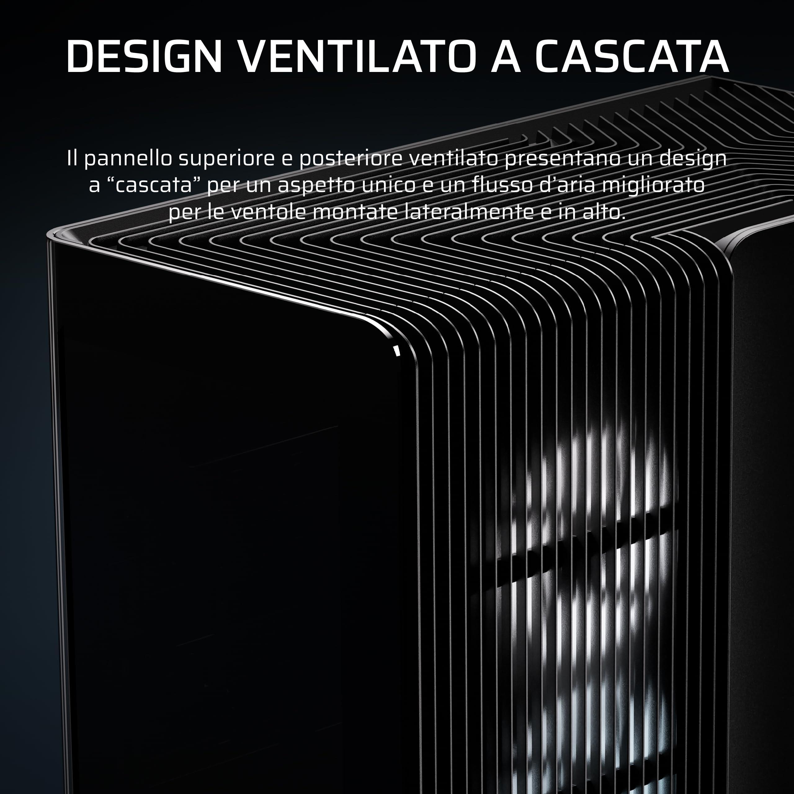 - Design industriale a cascata – Le linee pulite scendono a cascata sull'esterno dello chassis, offrendo generose aperture per il flusso d'aria e un look davvero unico.