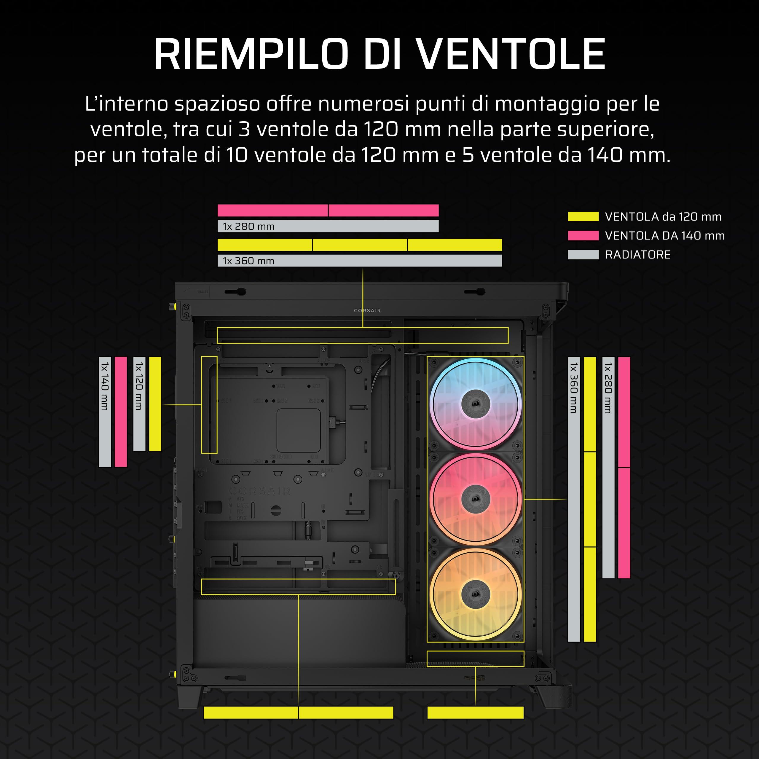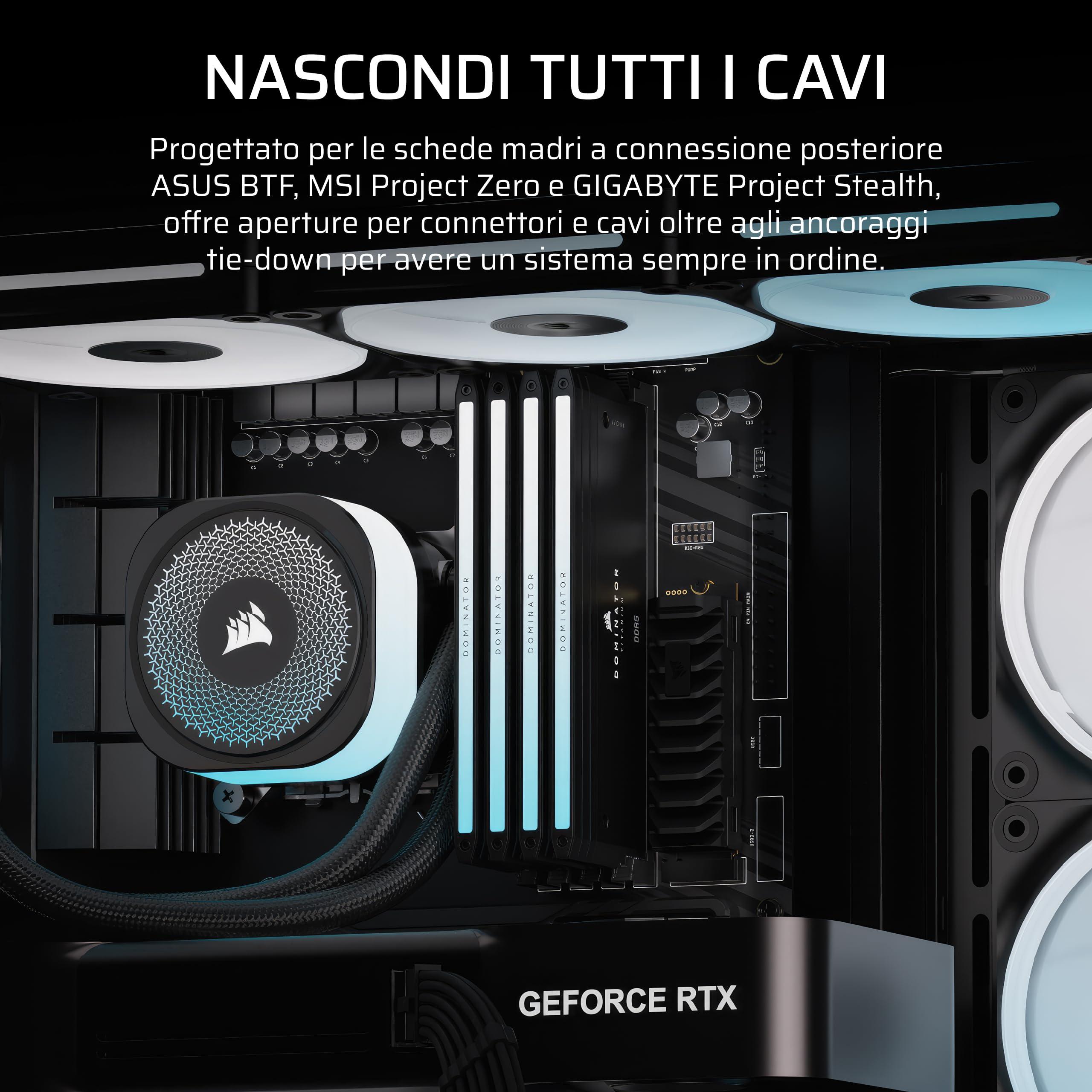 - Sistema di montaggio della ventola CORSAIR InfiniRail – Questo sistema di montaggio multipunto in acciaio offre una flessibilità senza pari nelle configurazioni della ventola del tetto. Basta far scorrere la guida per montare ventole da 120 mm o 140 mm dove si preferisce, garantendo un flusso d'aria mirato senza i vincoli del montaggio fisso.