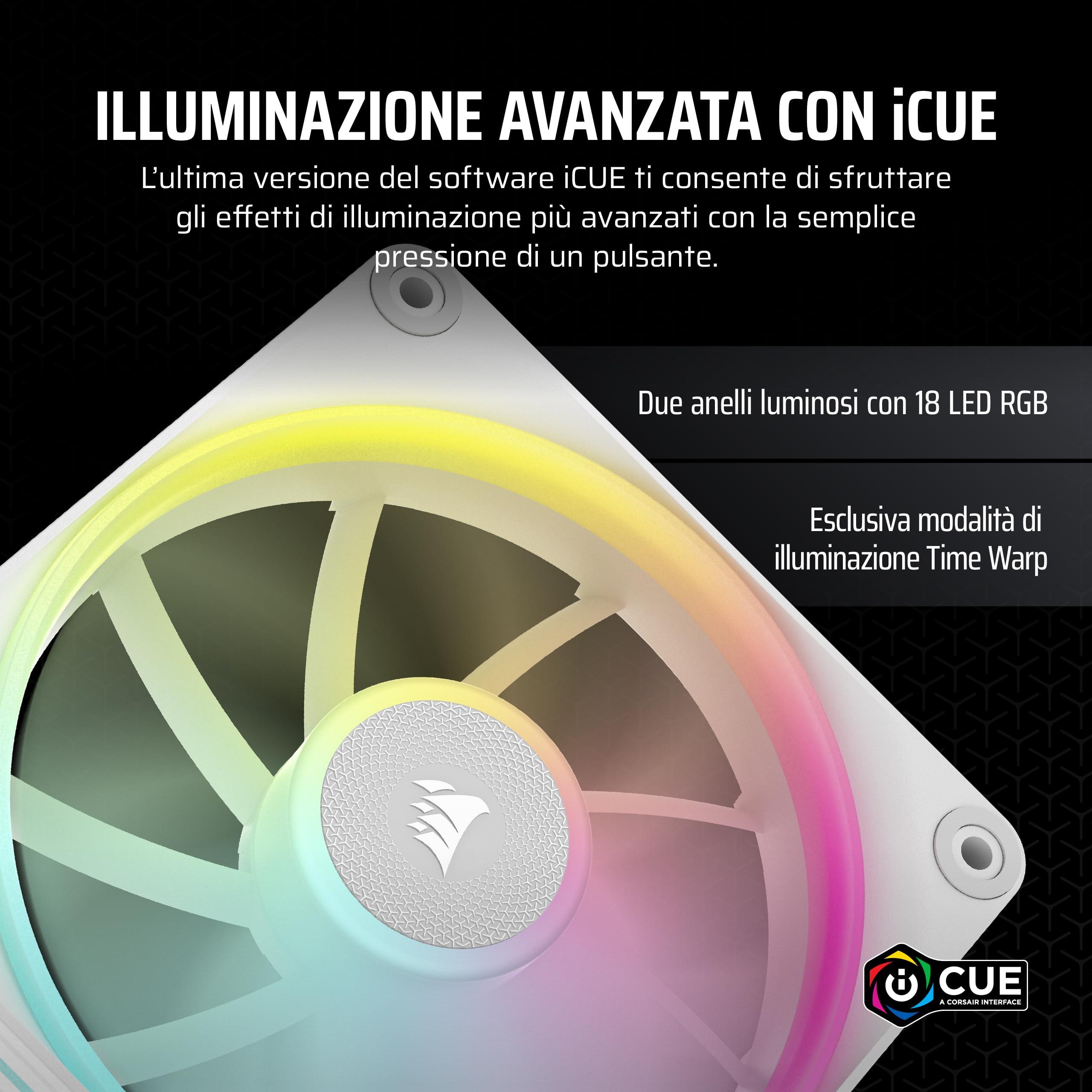 - Illuminazione RGB straordinaria con doppio anello luminoso: 18 LED per ventola distribuiti su un loop interno ed esterno consentono un'illuminazione brillante e personalizzabile che può essere sincronizzata con tutti i dispositivi iCUE RGB