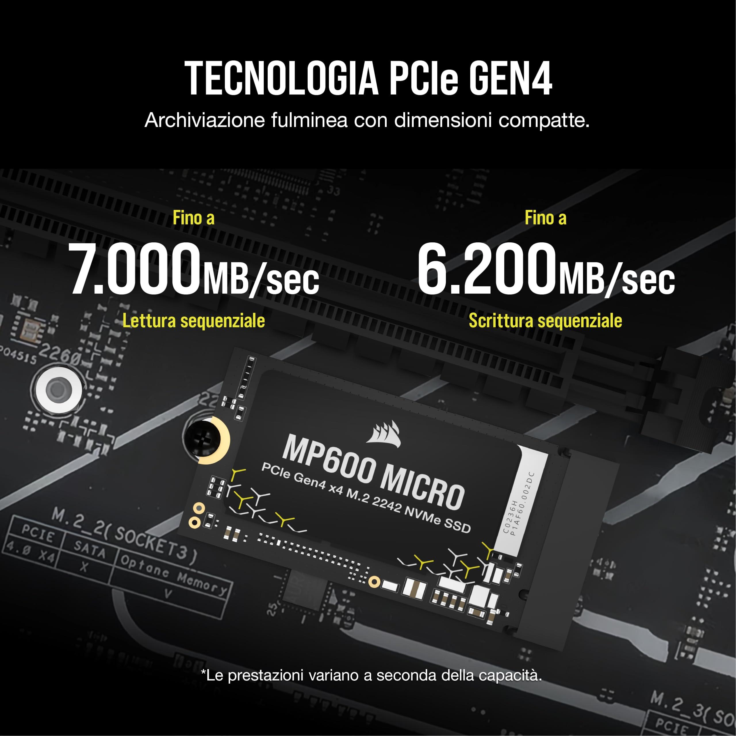 - Interfaccia ultra rapida PCIe 4.0 x4 NVMe 1.4: con tecnologia PCIe Gen4 per la massima larghezza di banda, che consente all’unità MP600 MICRO di offrire prestazioni di archiviazione straordinarie