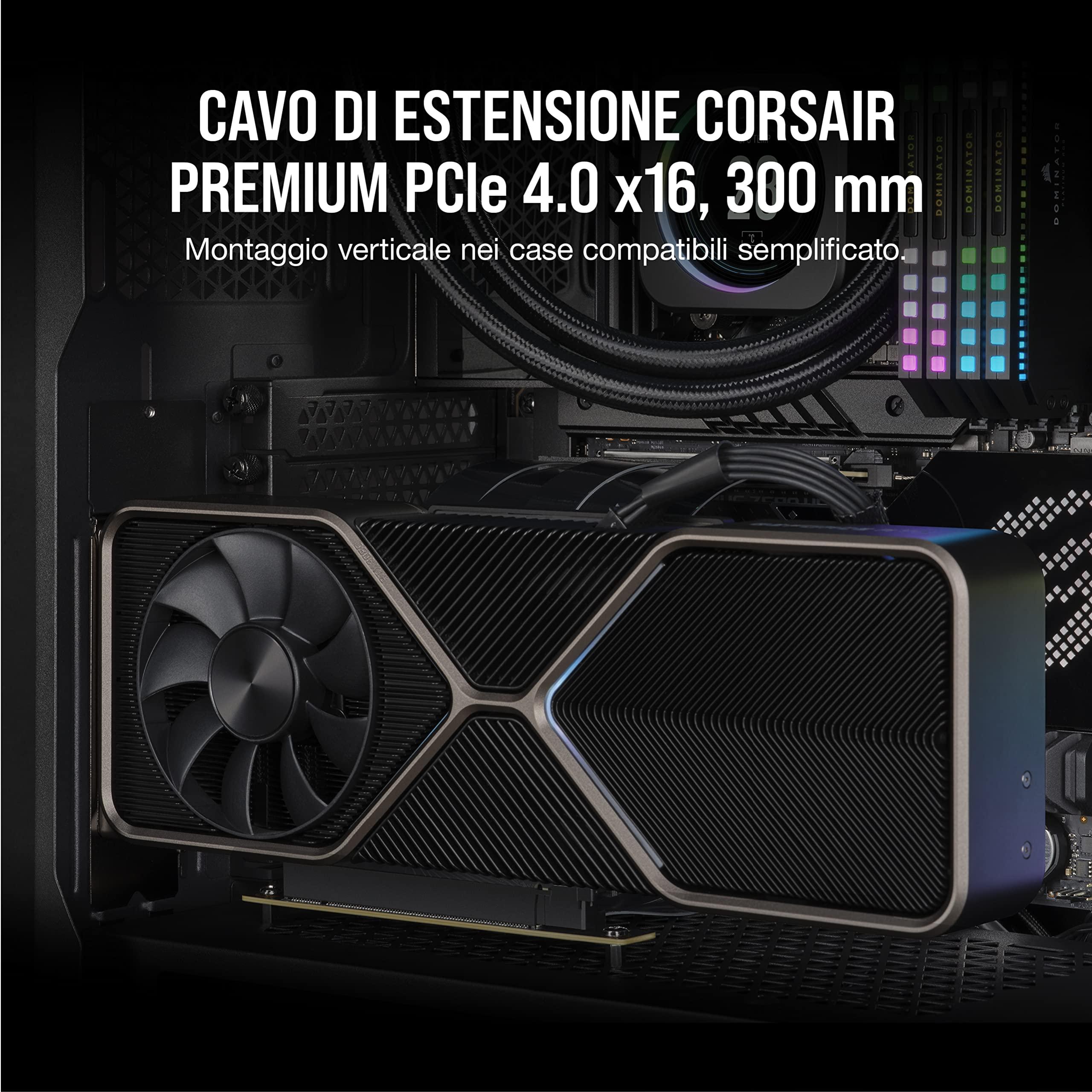 Corsair Premium PCIe 4.0 x16, 300 mm Cavo di Estensione - con Schermatura EMI - PCIe Femmina con Angolo di 90 - Compatibile con PCIe 3.0 per Una Maggiore Retrocompatibilità - Nero