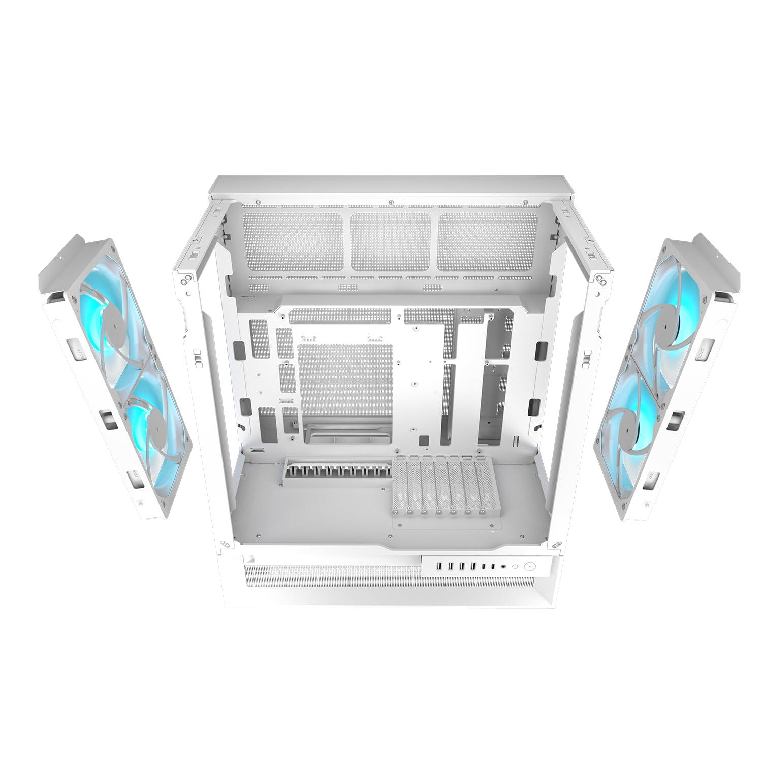 - ● Il design perfettamente simmetrico consente il posizionamento omnidirezionale. ● Supporto ventola Quad 160mm PWM con modalità di aspirazione flessibili. ● Lo scomparto base integrato rivoluziona la gestione dei cavi a visibilità zero. ● Il sistema di guide scorrevoli consente il trasferimento del modulo IO e l'array di porte espanso. ● L'allineamento naturale della GPU montata verticalmente con la gravità riduce il rischio di danni da spostamento. ● Ospita una lunghezza massima della GPU di 380 mm. ● Compatibile con schede madri con connettore inverso. ● Il pannello magnetico del filtro antipolvere e le coperture del vano di gestione dei cavi a sgancio rapido rendono la manutenzione un gioco da ragazzi.