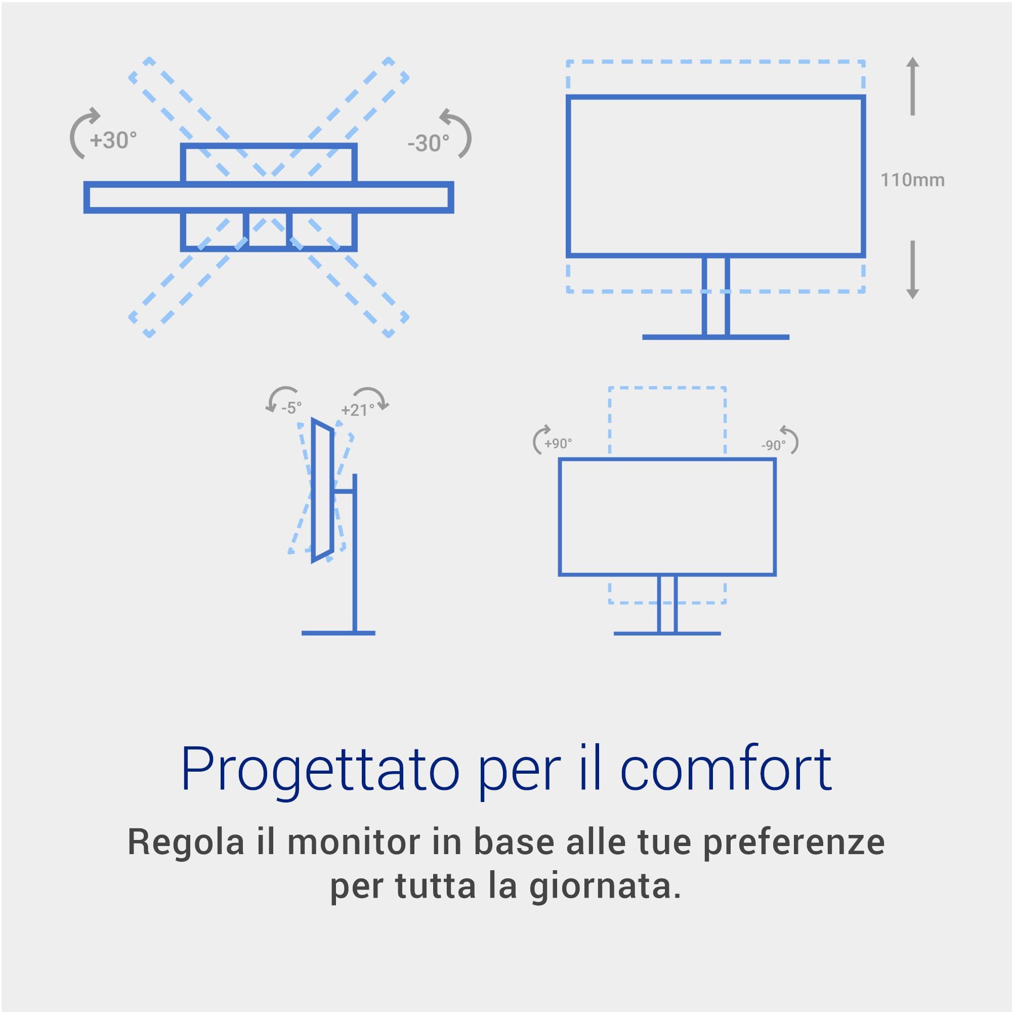 - DESIGN ERGONOMICO & CONNETTIVITÀ – Supporto regolabile in altezza (110 mm), inclinazione (-5°/+21°), rotazione (±30°) e pivot (±90°). Due porte HDMI compatibili FHD 144Hz con AMD FreeSync.