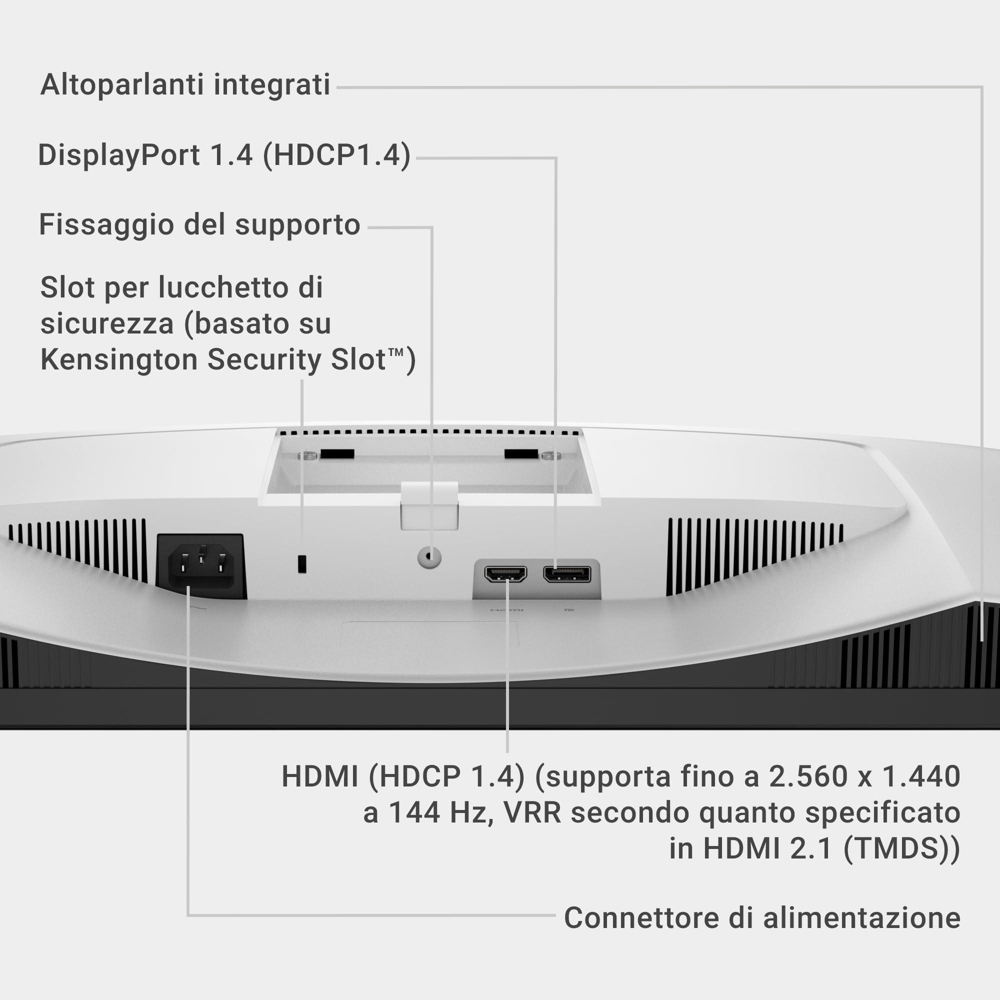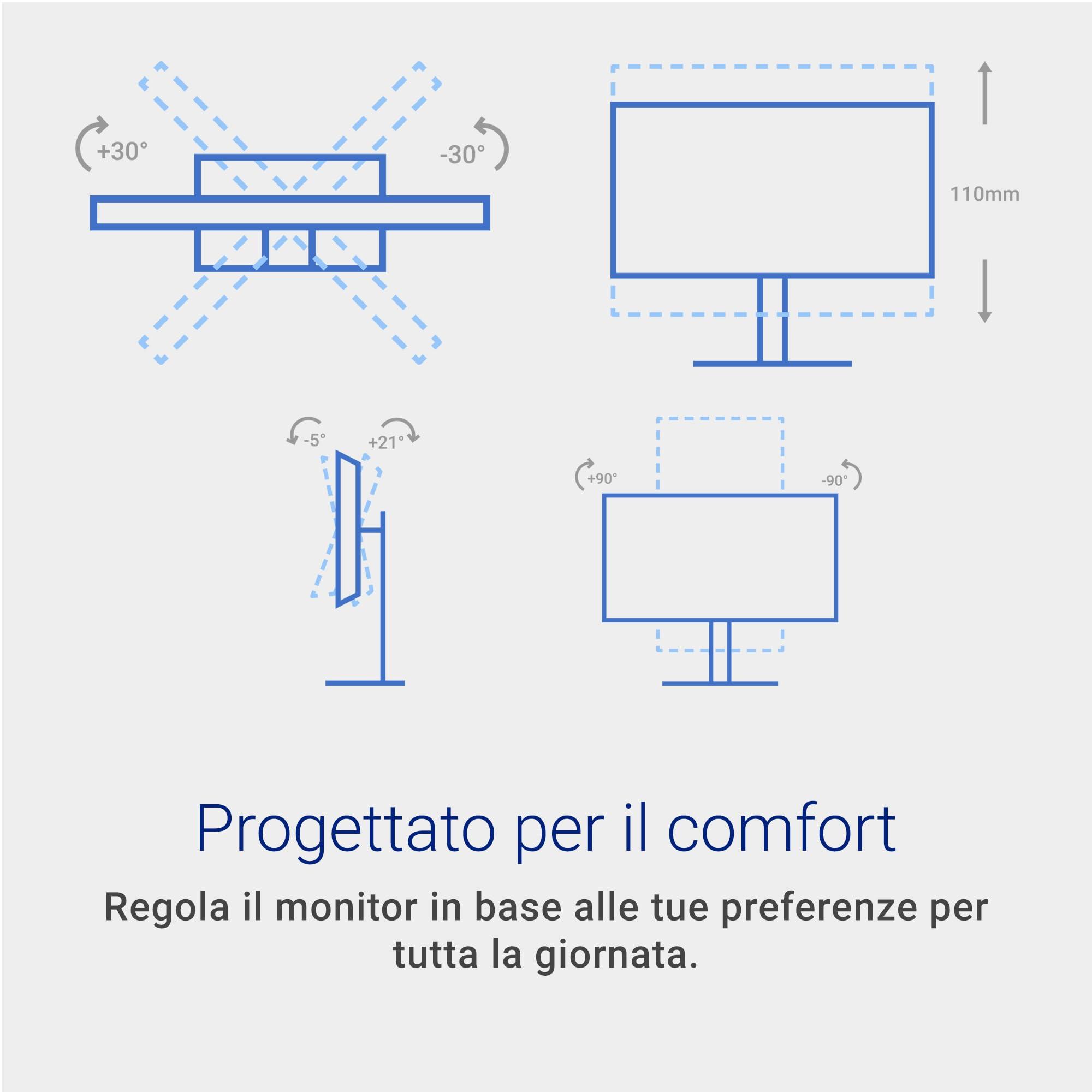 - DESIGN ERGONOMICO & CONNETTIVITÀ – Supporto regolabile in altezza (110 mm), inclinazione (-5°/+21°), rotazione (±30°) e pivot (±90°). HDMI e DisplayPort compatibili QHD 144Hz con AMD FreeSync.