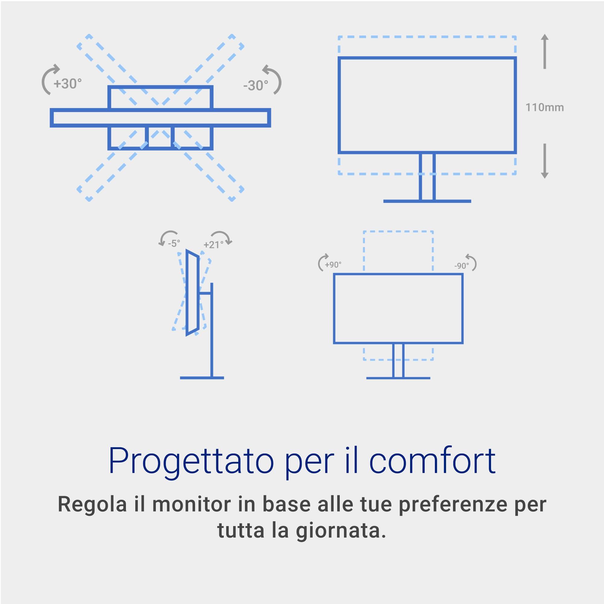 - COMFORT VISIVO & ERGONOMIA – Certificazione TÜV Comfort Visivo 4 stelle con tecnologia flicker-free e riduzione della luce blu, più regolazioni in altezza, inclinazione, rotazione e pivot per il massimo comfort.