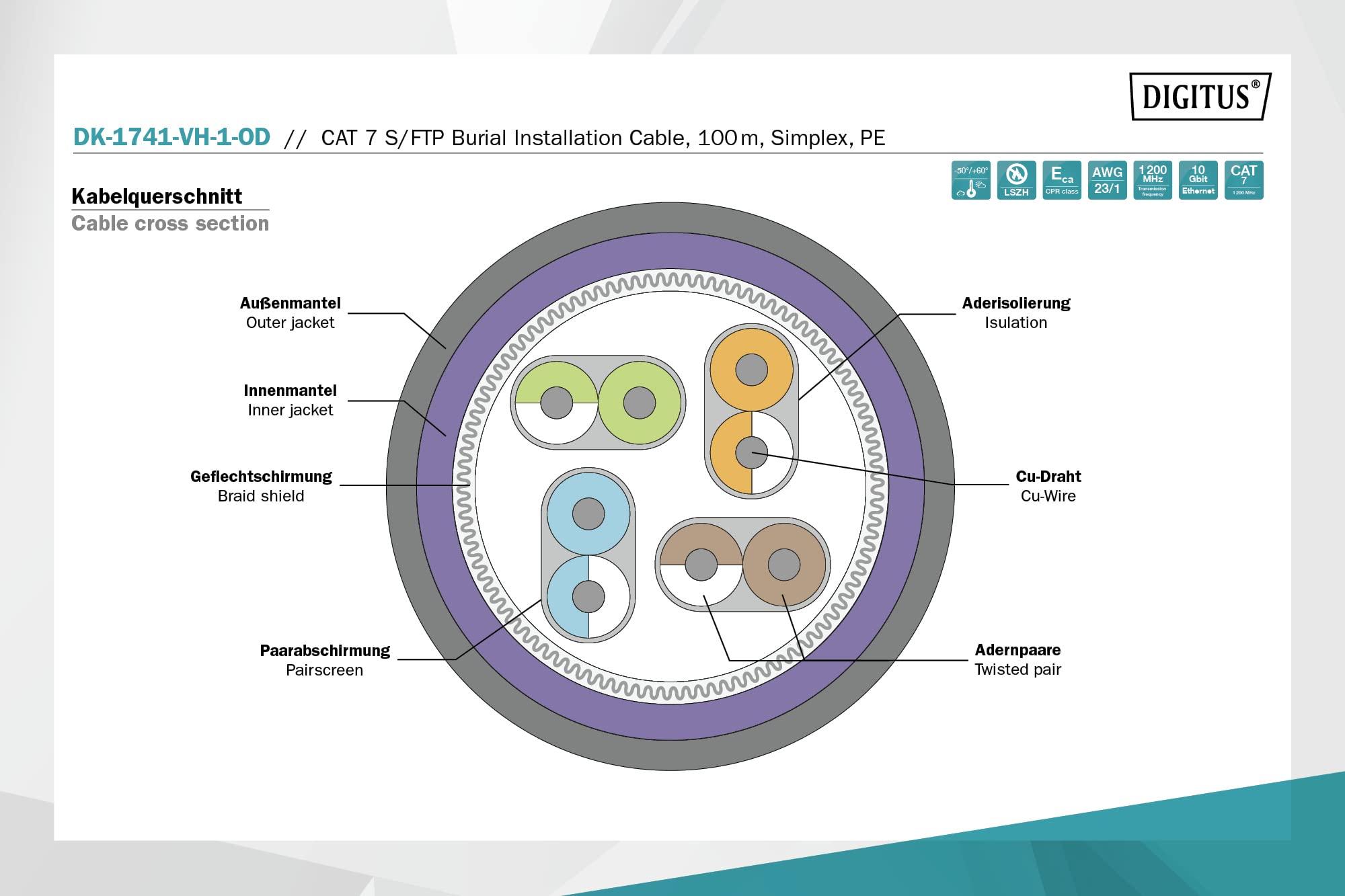 DIGITUS 100 m Cavo di rete Cat 7 per esterni - S-FTP (PiMF) Simplex - BauPVO Eca - LSZH Senza alogeni - 1200 MHz rame AWG 23/1 - Compatibile PoE+ - Cavo di terra Cavo LAN - Nero