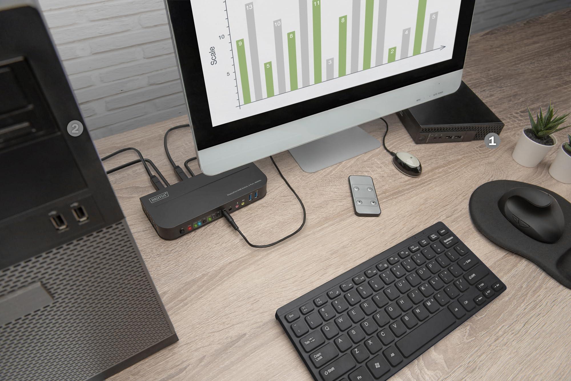 DIGITUS KVM Switch DisplayPort – Display singolo a 2 porte – 2 PC 1 Monitor – 1x Mouse, tastiera e audio per 2 computer – UHD 4K@60Hz (4096 x 2160p) – Hot-Key KVM Switch – 2x Hub USB 3.0 – Nero