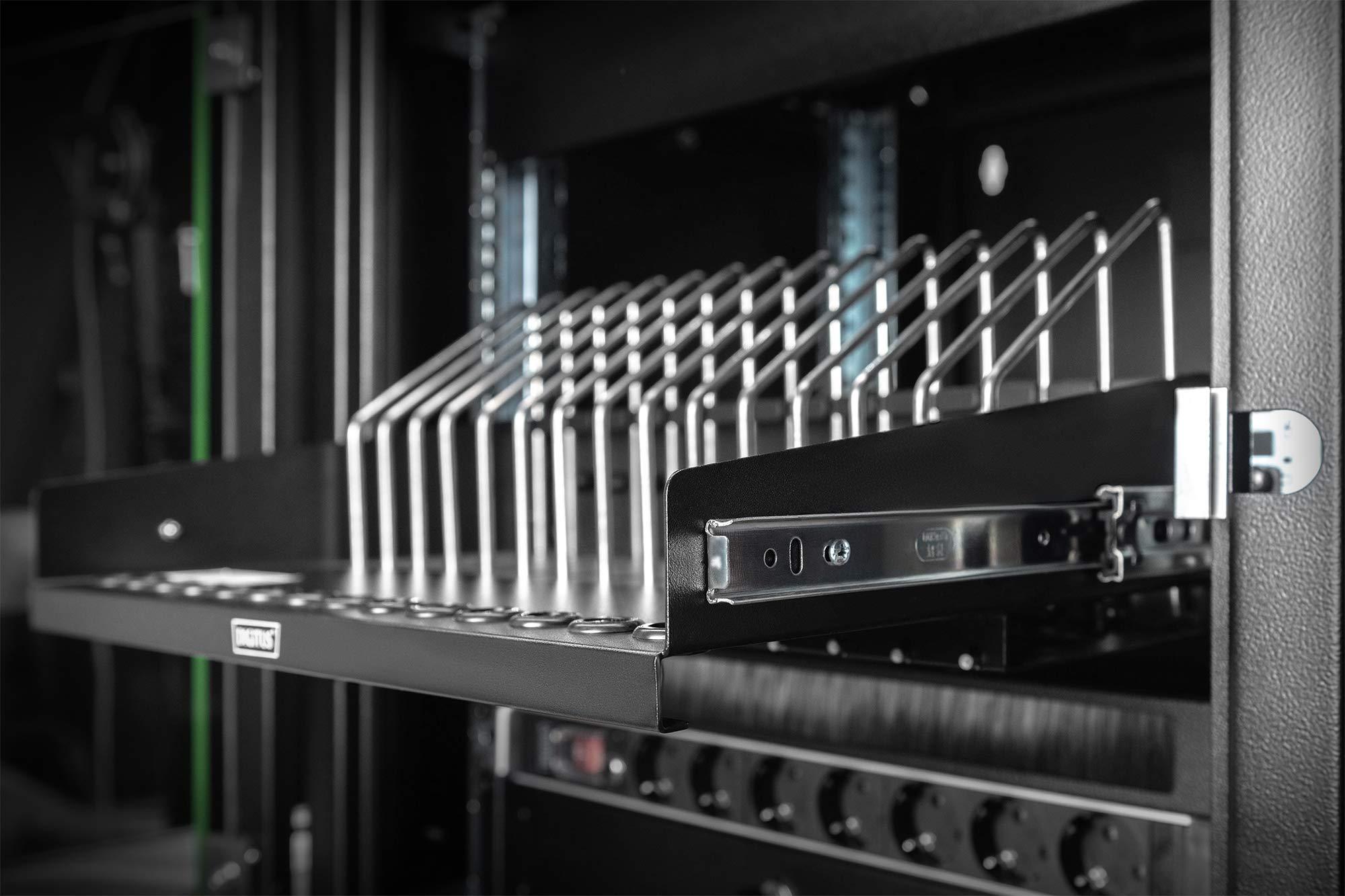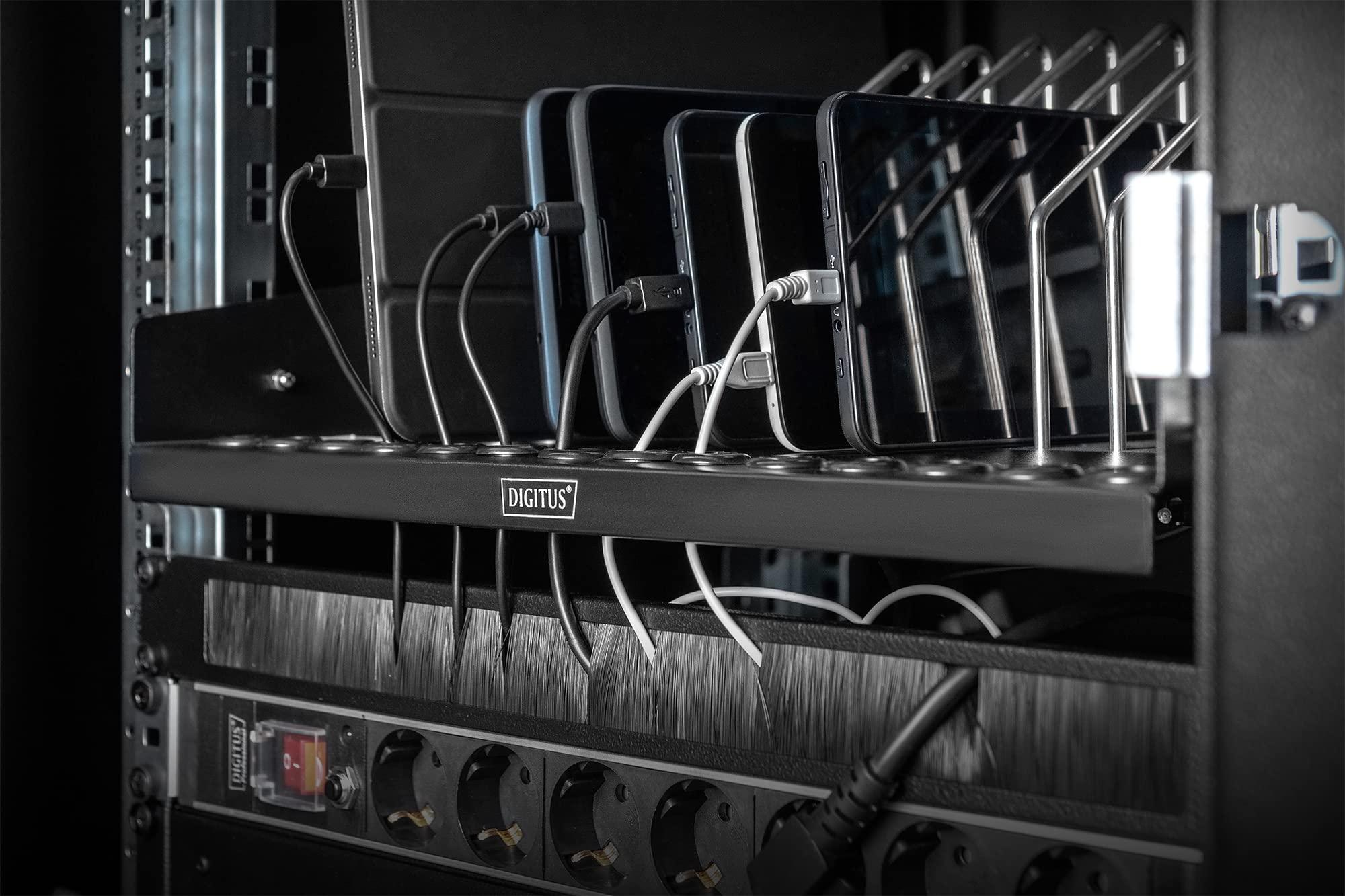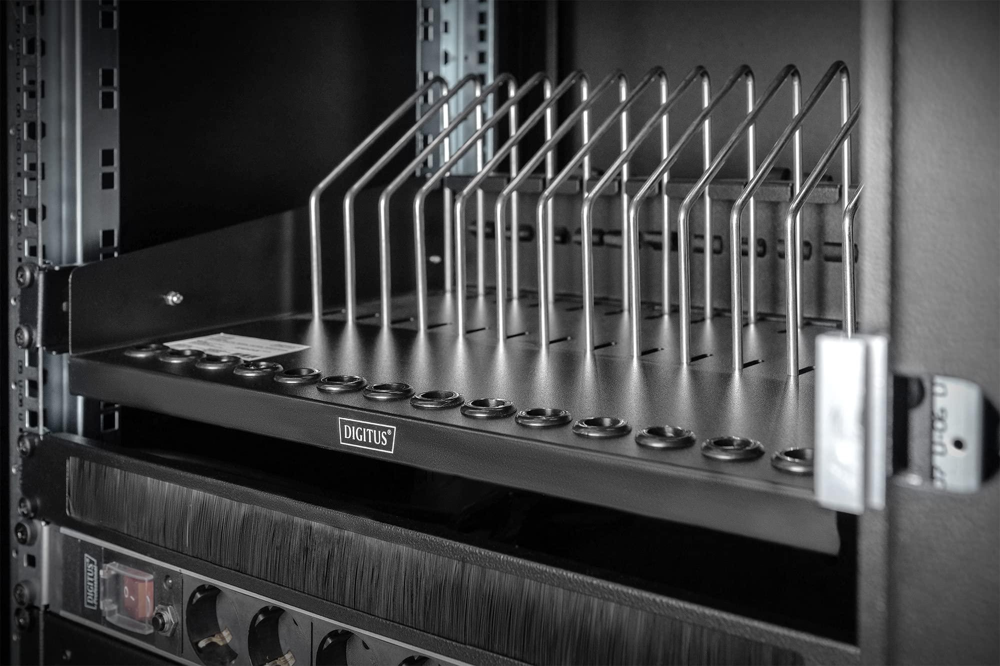 DIGITUS Scaffale da 19 pollici - 4,5 U - Estensibile - Stazione di ricarica - Per 14 tablet, notebook e smartphone - Per armadi di rete e server da 19 pollici - Nero