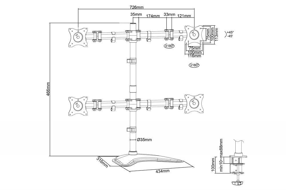 - Elevata flessibilità: grazie allo standard VESA, è possibile montare schermi con standard VESA 75x75 e 100x100 - I supporti per monitor possono essere inclinati di +45°/-45° e ruotati di 360