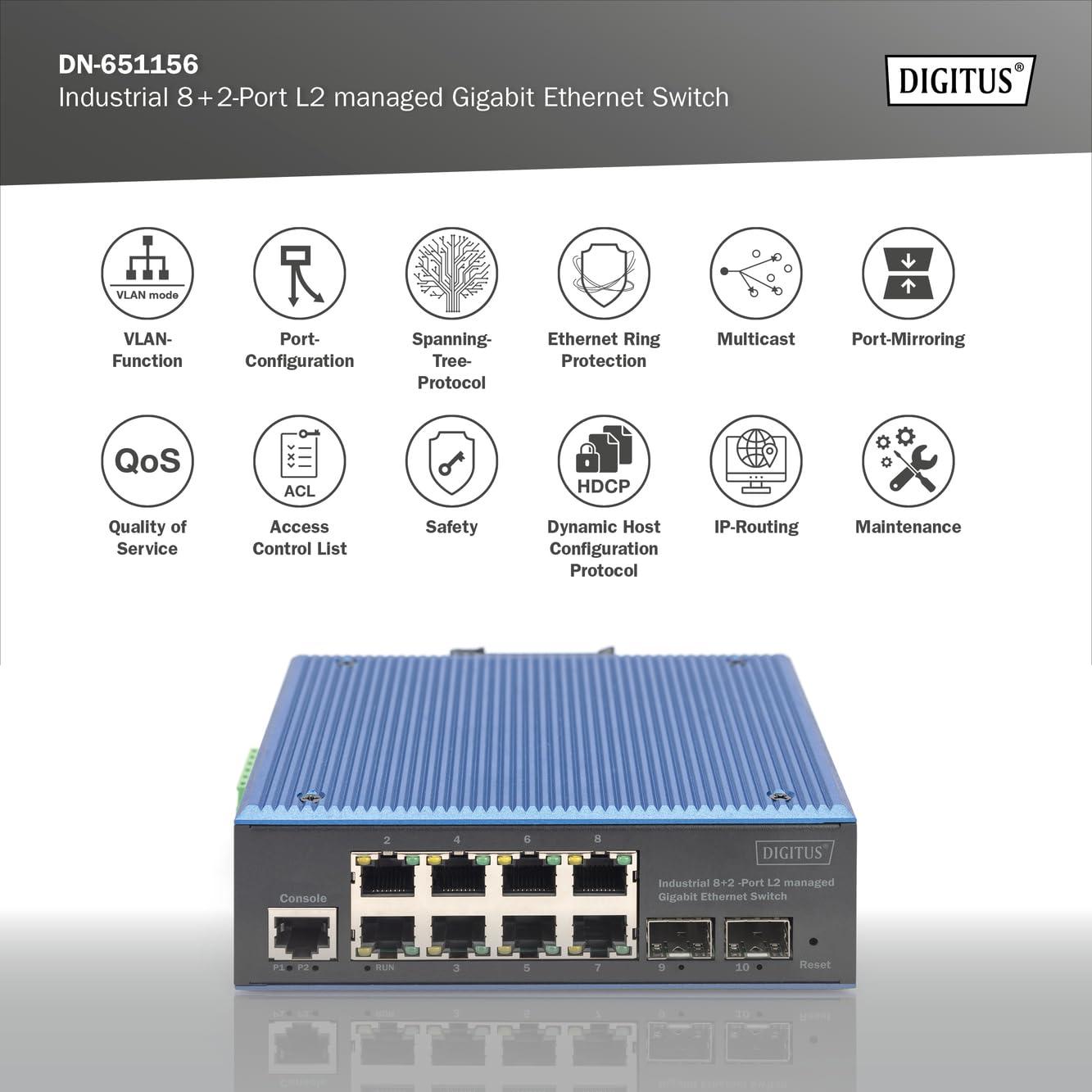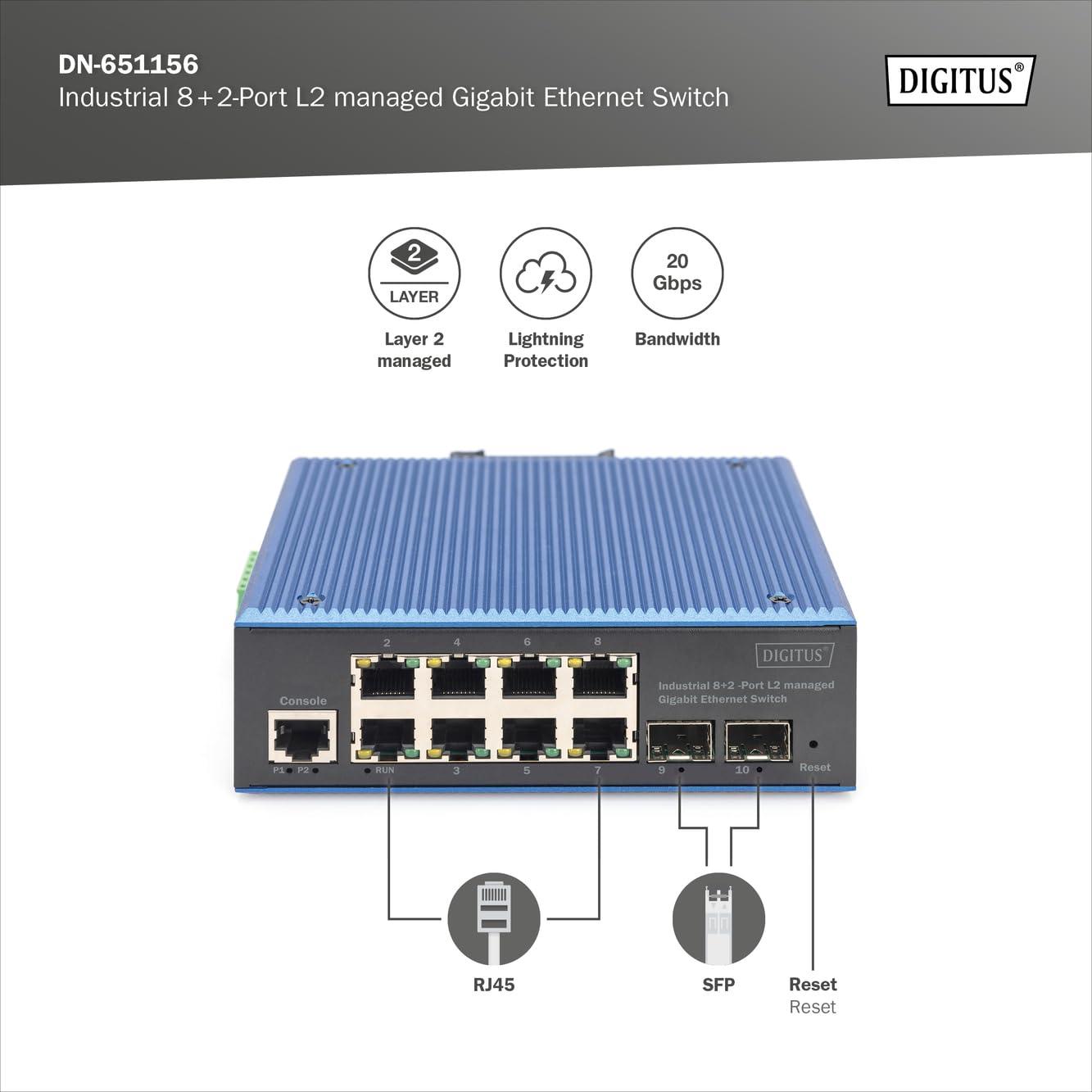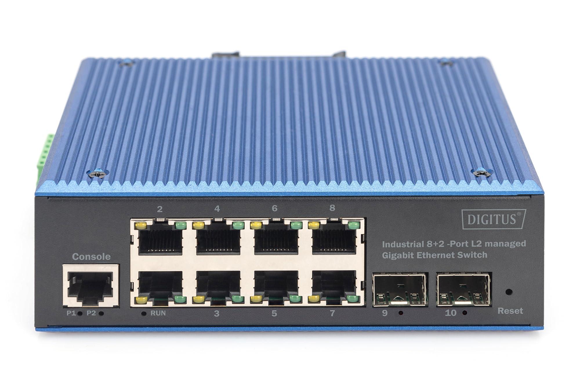 DIGITUS Switch di Rete - 10 Porte Gigabit Ethernet - 8X RJ45 + 2X SFP - IP40 - L2 gestito - 10/100/1000 Mbit/s - Montaggio su Guida DIN - Serie Industriale - Nero/Blu
