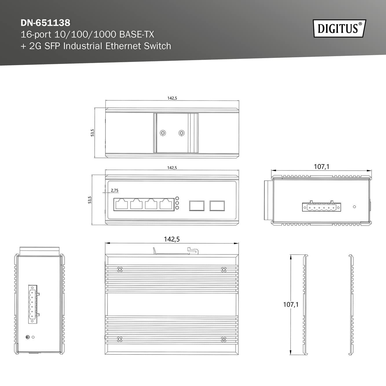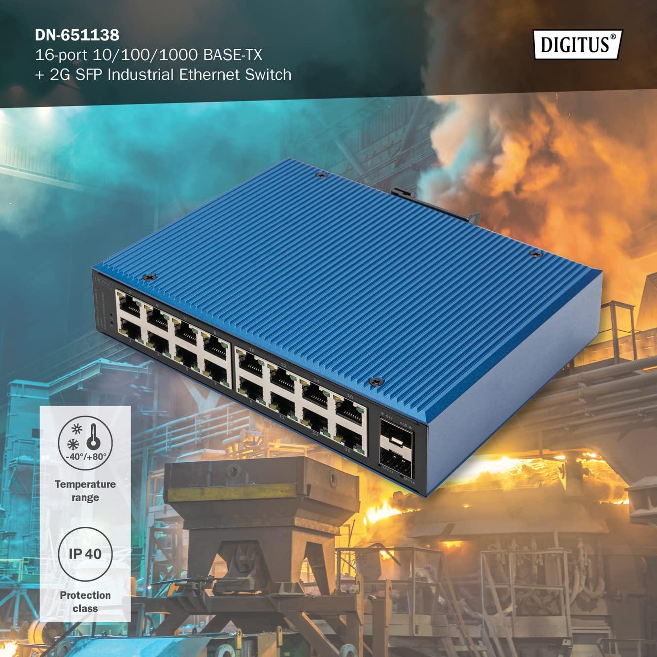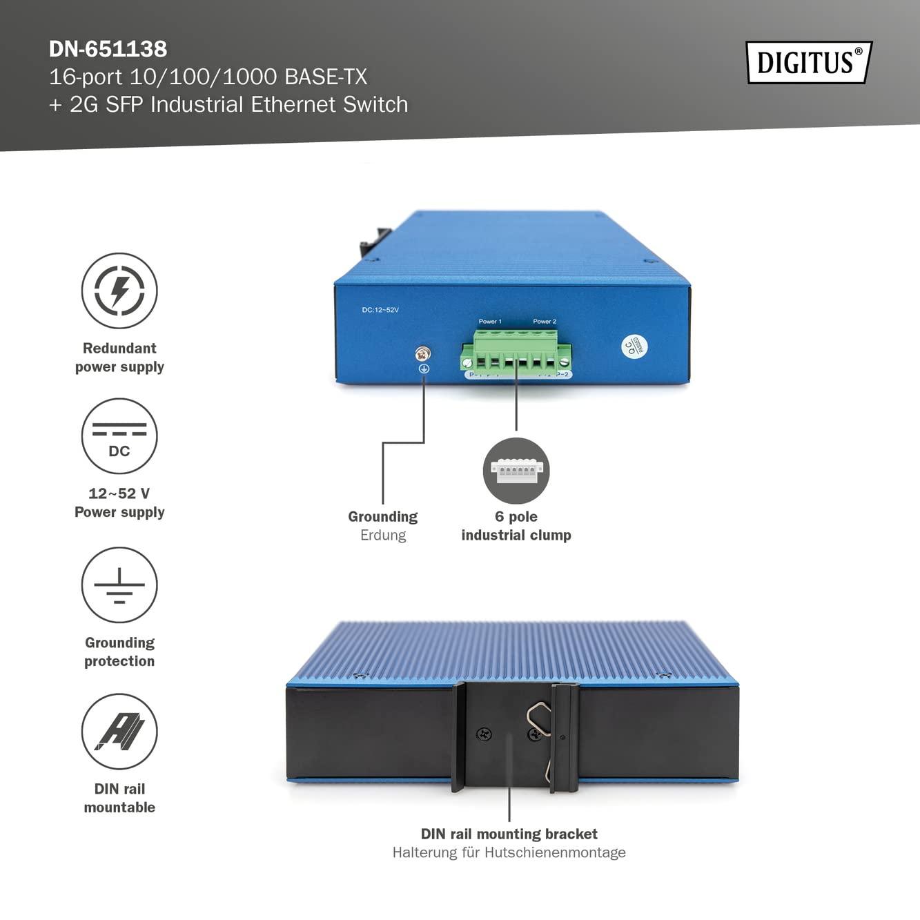 DIGITUS Switch di rete - 18 porte Gigabit Ethernet - 16x RJ45 + 2x porta SFP - Non gestito - 10/100/1000 Mbit/s - Montaggio su guida DIN e a parete - IP40 - Serie industriale - Blu