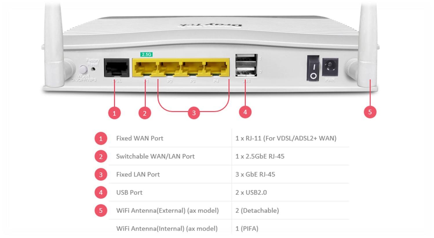 - Interfaccia 2,5GbE per banda larga in fibra: sfrutta appieno la banda larga in fibra con la porta WAN 2,5GbE del Vigor 2767 e un throughput NAT fino a 2,3 Gigabit.