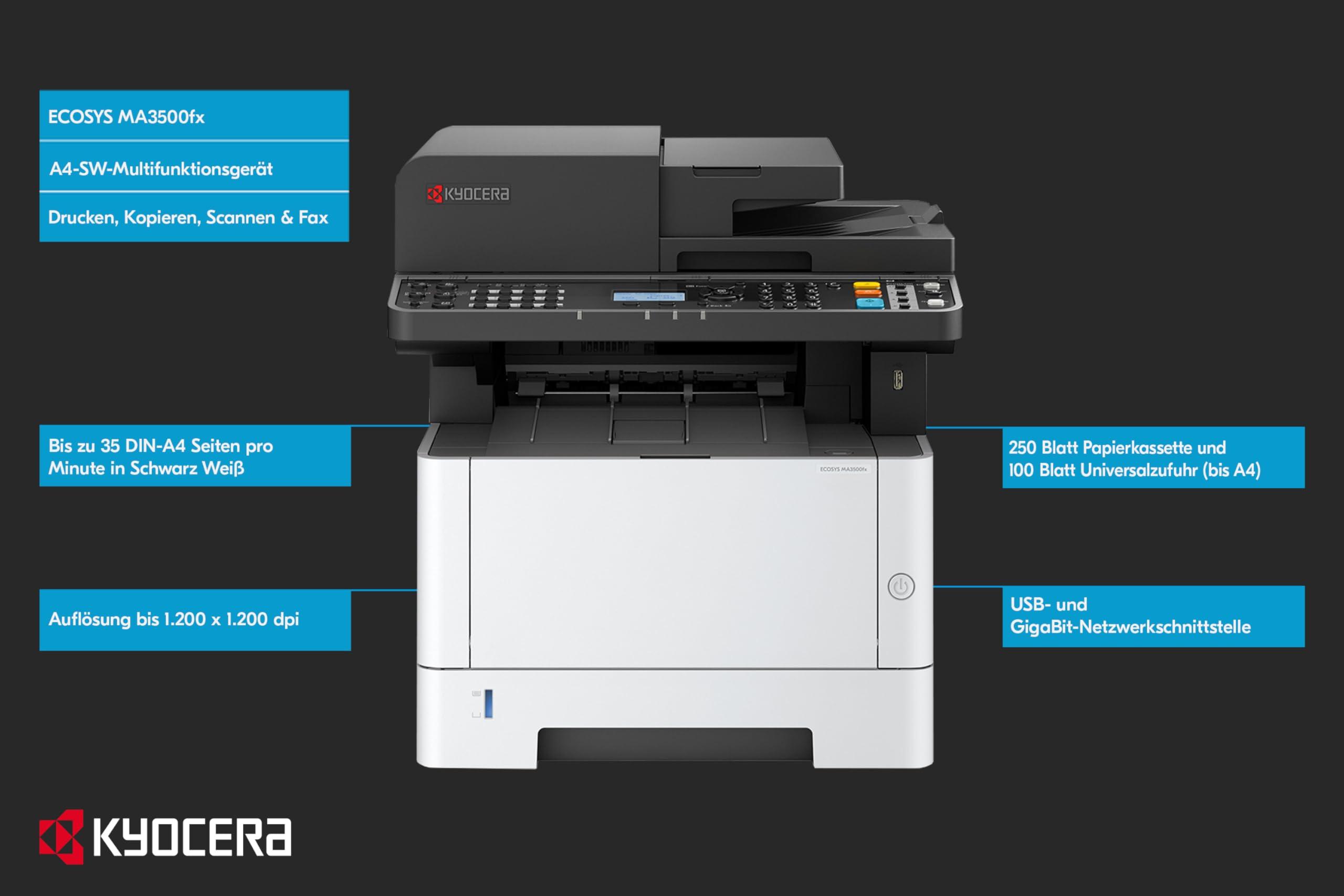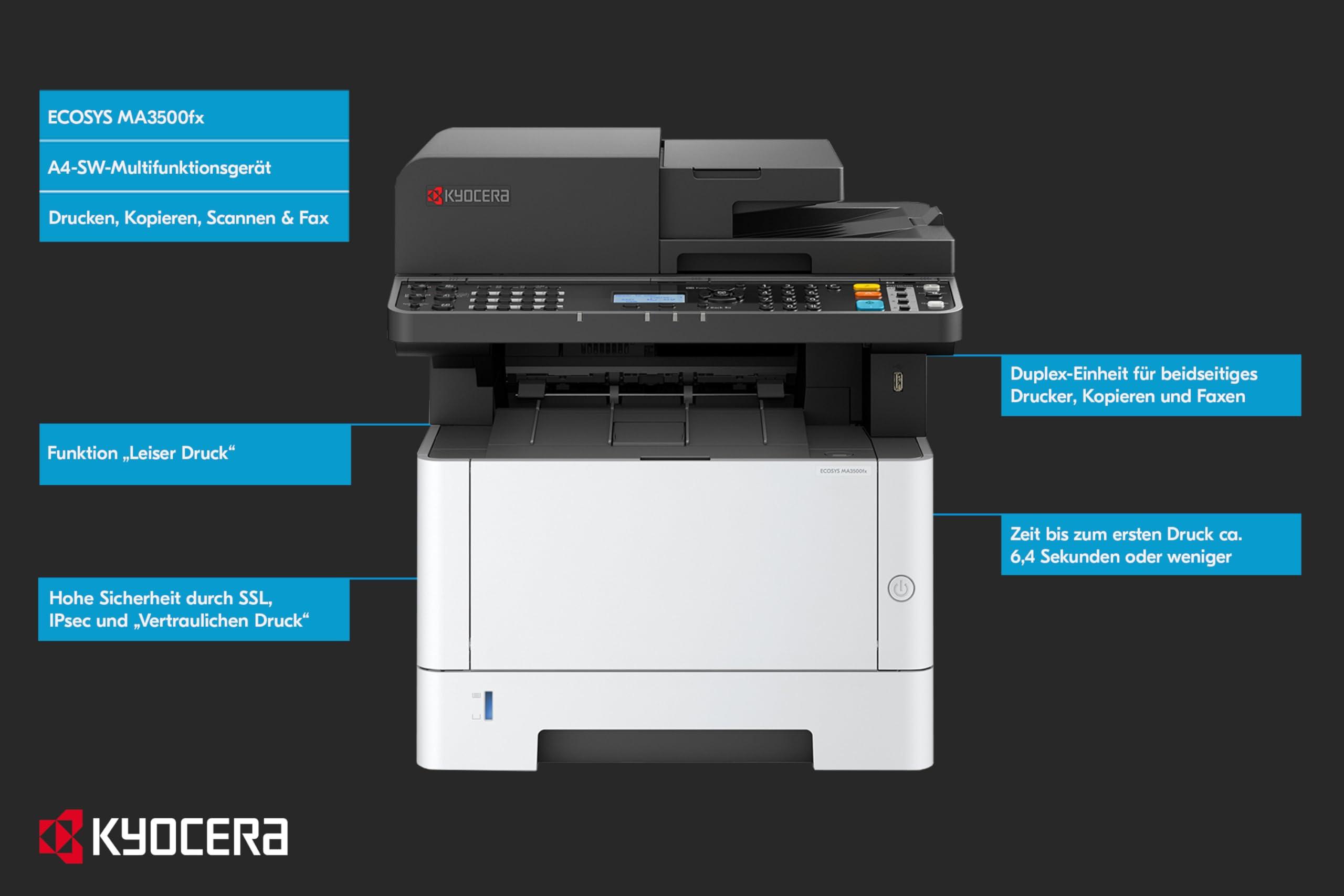 - Affidabile: la stampante multifunzione laser Ecosys MA3500fx è progettata per stampare, copiare, scansionare e fax veloci grazie alla risoluzione 1200 dpi con la massima qualità di stampa