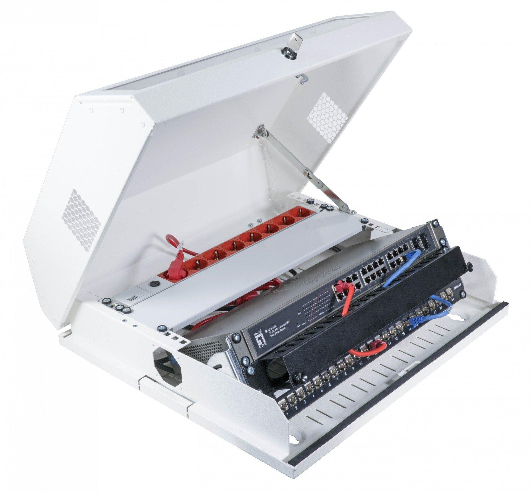 - Alloggiamento in lamiera d'acciaio per montaggio a parete, completamente premontato · 3HE per incasso verticale di componenti da 19" · 5HE anche per l'installazione orizzontale di componenti da 19" · Lavoro a parete (solo 150 mm di profondità) · Livello 3HE orientabile a 180° · Coperchio con finestra trasparente, aufklapp, einrast e con chiusura a chiave