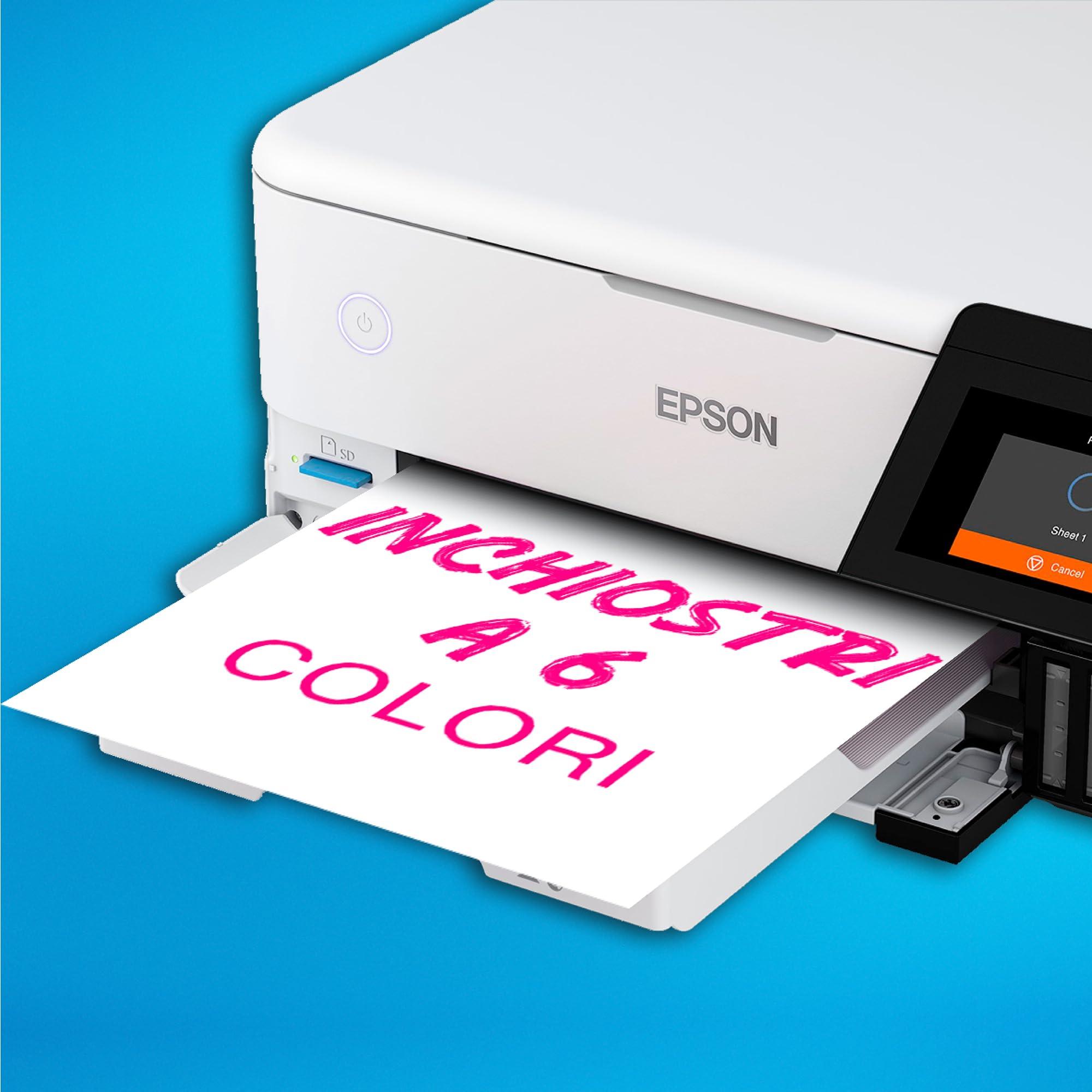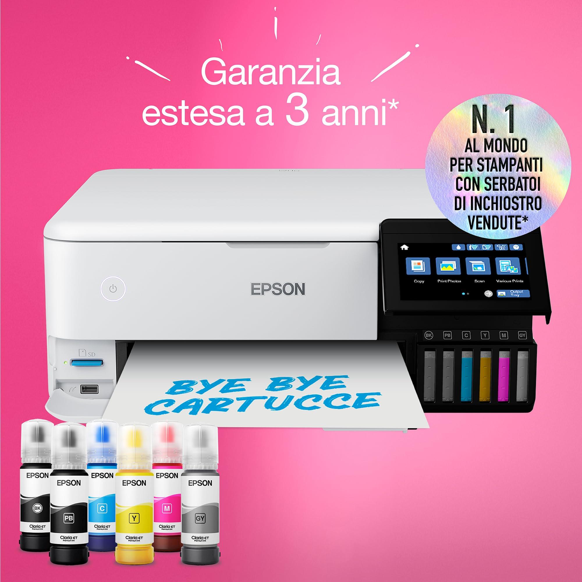 SISTEMA DI INCHIOSTRO A 6 COLORI Gli inchiostri Epson Claria ET Premium producono foto di alta qualità e di lunga durata fino al formato A4, nonché foto in bianco e nero eccezionali con il nuovo inchiostro grigio. L'inchiostro nero a pigmenti è ideale per stampare testi nitidi su carta comune. RISPARMIA TEMPO e DENARO Questa stampante economica ti consente di stampare fino a 2.300 foto di alta qualità con un set di flaconi di inchiostro. I flaconi e i serbatoi sono progettati per essere facili da usare, il che significa niente seccature o confusione quando è il momento di ricaricare. FLESSIBILITÀ MODERNA con connettività Wi-Fi completa, Wi-Fi Direct ed Ethernet, puoi facilmente integrare questa stampante con la tua configurazione domestica esistente. Puoi anche stampare da schede SD e unità flash USB tramite il touchscreen a colori da 10,9 cm. COMPATIBILITÀ CON SUPPORTI ARTISTICI L'ET 8500 è dotato di vassoi anteriori per carta in formato fotografico e A4 e stampa direttamente su CD/DVD adatti. Il vassoio posteriore accetta supporti speciali come carta kraft e cartoncino, mentre l'alimentazione diretta della carta A4 consente di stampare su supporti fino a 1,3 mm di spessore e 2 m di lunghezza.