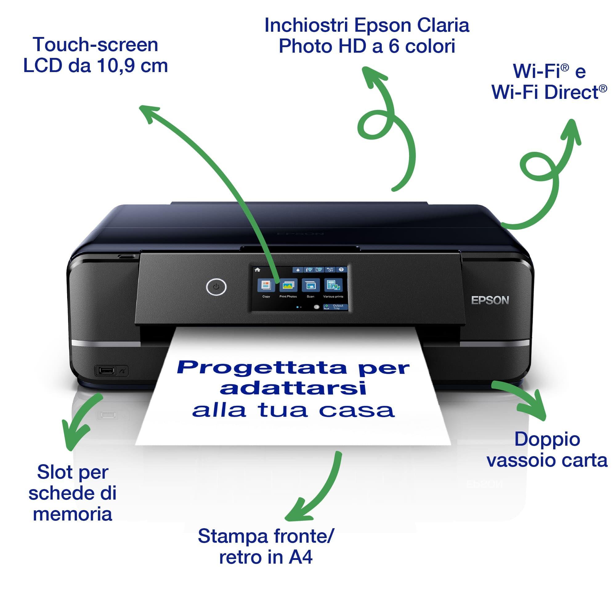 - Soluzioni di stampa flessibili. Stampa wireless da smartphone e tablet utilizzando l'app gratuita Epson iPrint*. Puoi anche usare l’app Creative Print* di Epson che consente di utilizzare le foto per creare e stampare fotolibri, biglietti di auguri, collage e altro.