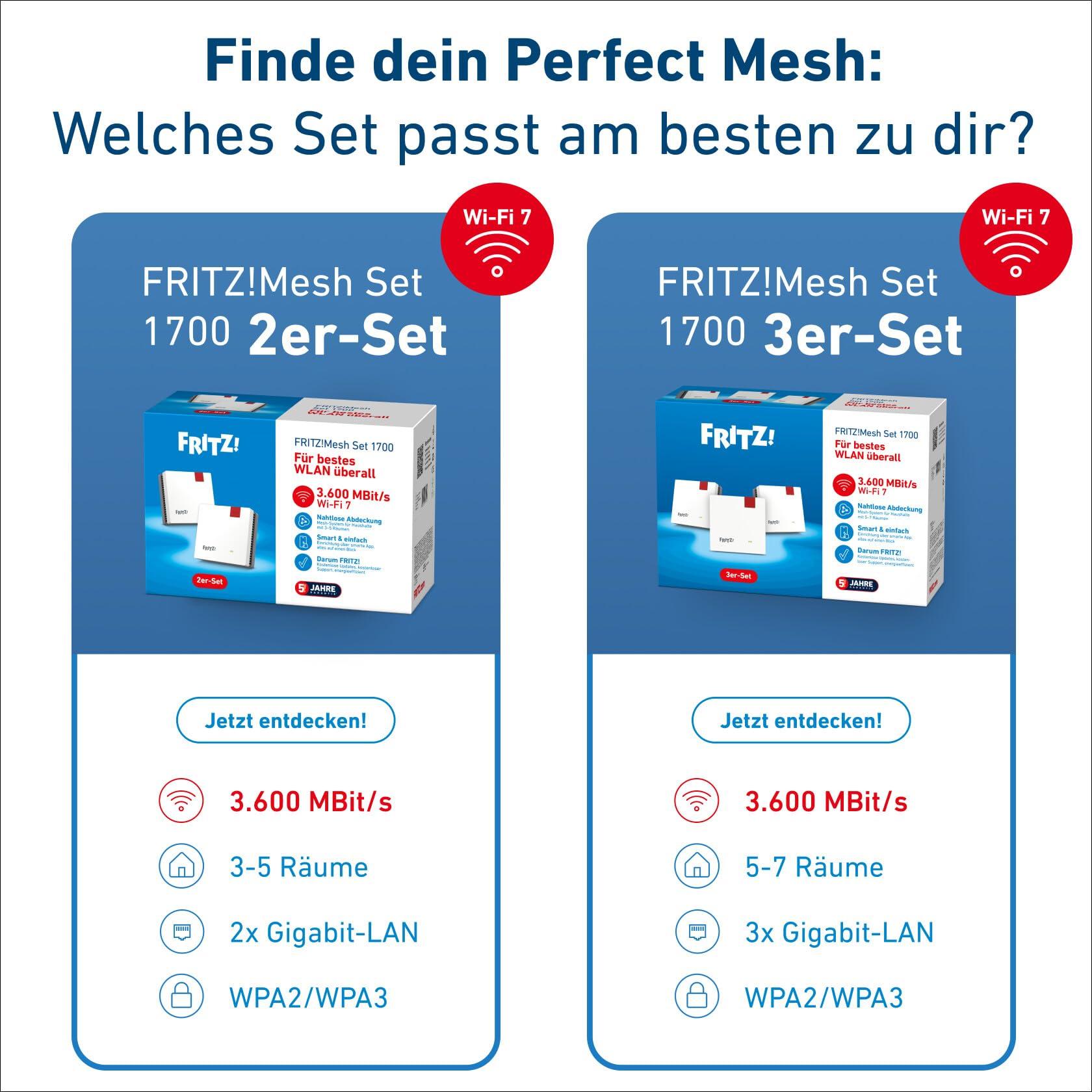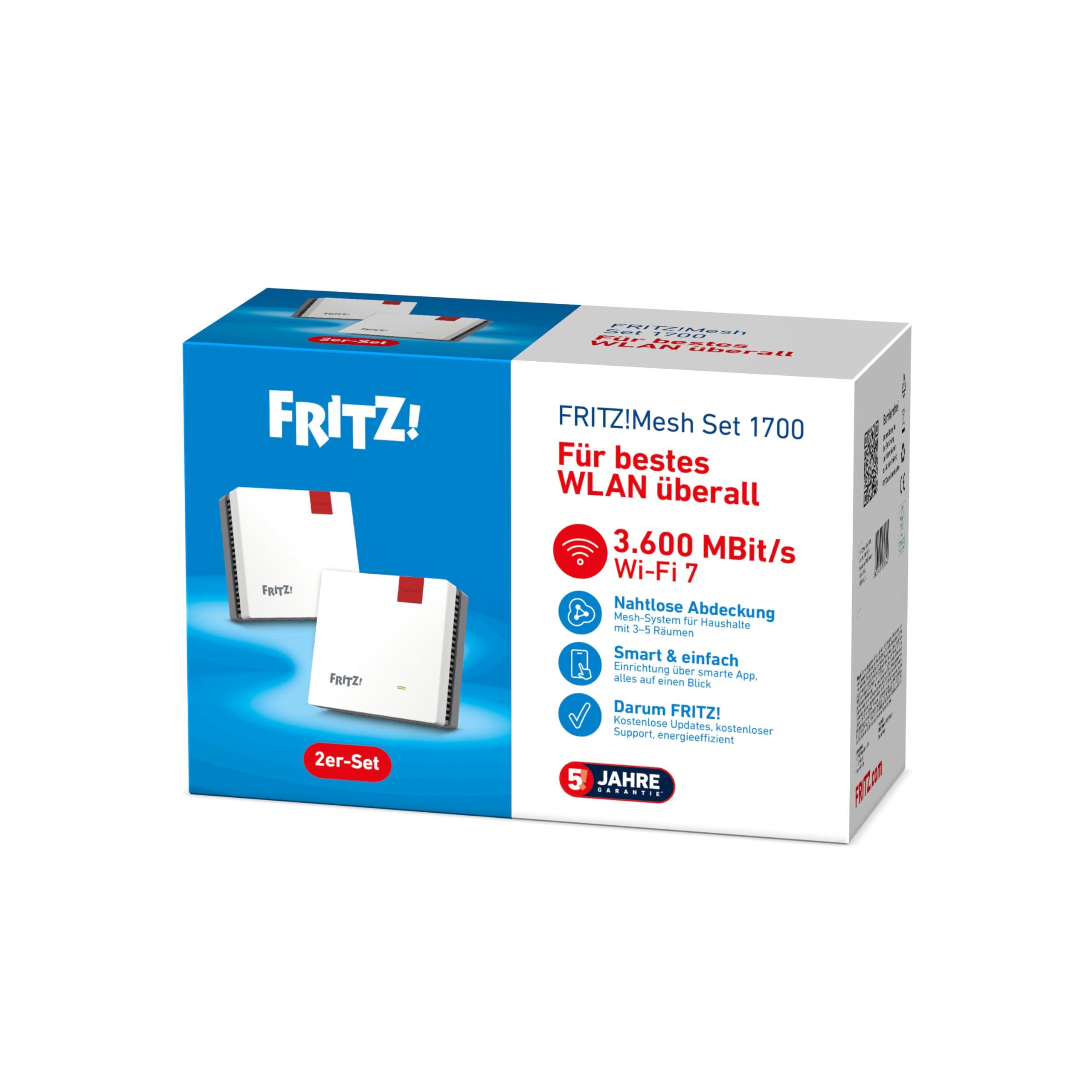FRITZ! Set di 2 maglie da 1700 | Wi-Fi veloce 7 fino a 3.600 Mbit/s | copertura Wi-Fi per 3-5 stanze | ideale per router Internet o modem in fibra ottica (ONT) | facile configurazione | Made in Europe