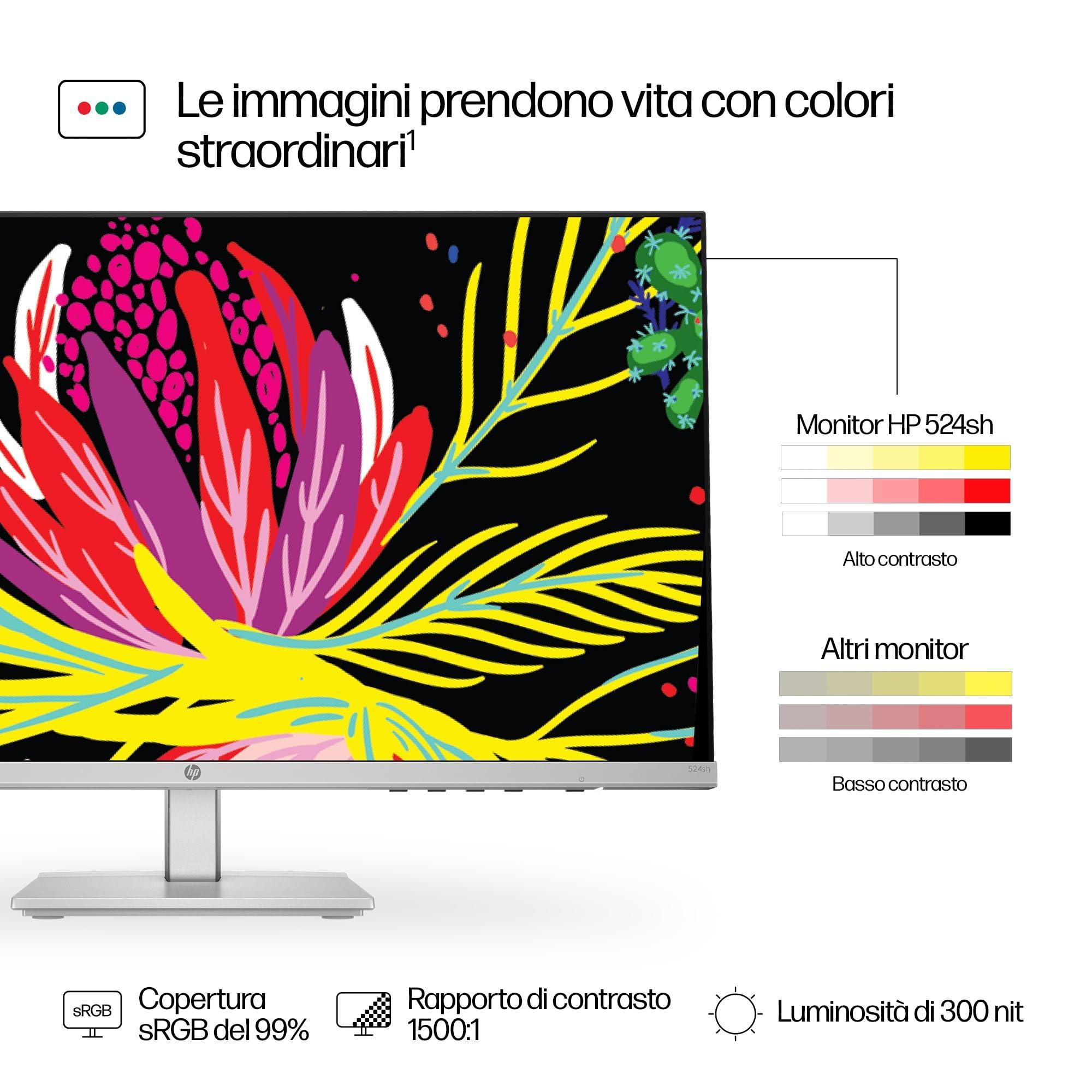 HP 524sh Monitor, Schermo da 23.8" FHD IPS Antiriflesso, Tecnologia Eye Ease, Tempo Risposta 5 ms GtG Overdrive, Risoluzione 1920 x 1080, Software Display Center, HDMI, Nero