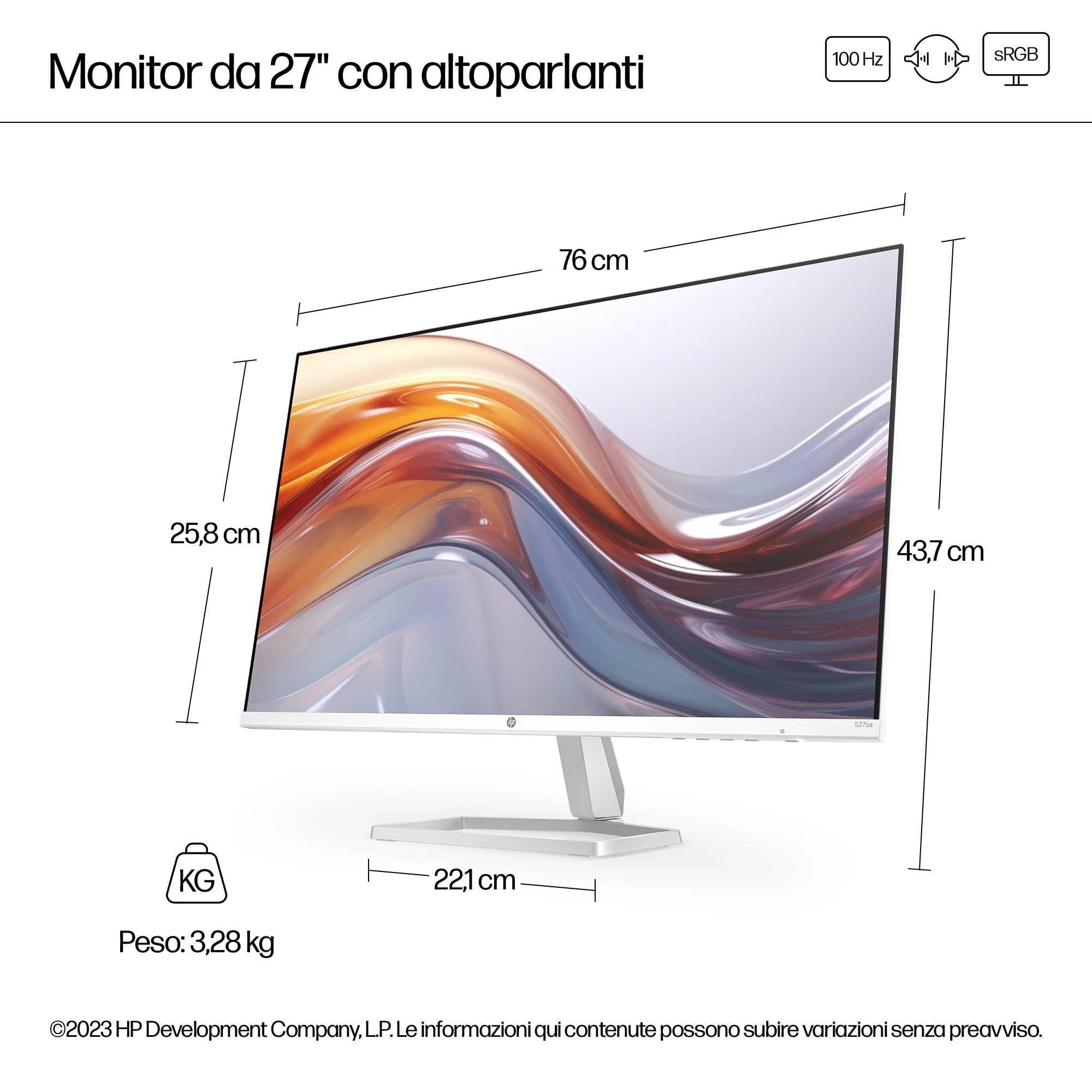 HP 527sa Monitor con Casse, Schermo da 27" FHD IPS Antiriflesso, Tecnologia Eye Ease, Tempo Risposta 5 ms GtG Overdrive, Risoluzione 1920 x 1080, Software Display Center, HDMI, Bianco