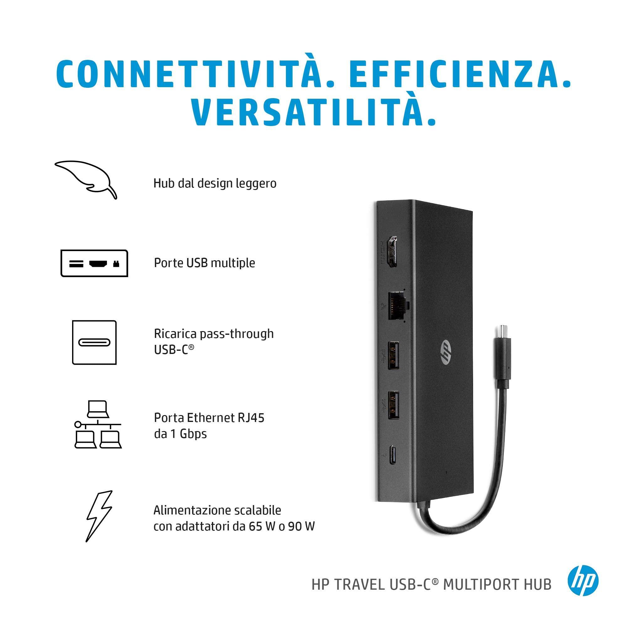 HP Hub Multi porta USB-C da Viaggio, Compatibile con PC dotati di Porta USB-C, Power Delivery e DisplayPort, Nero
