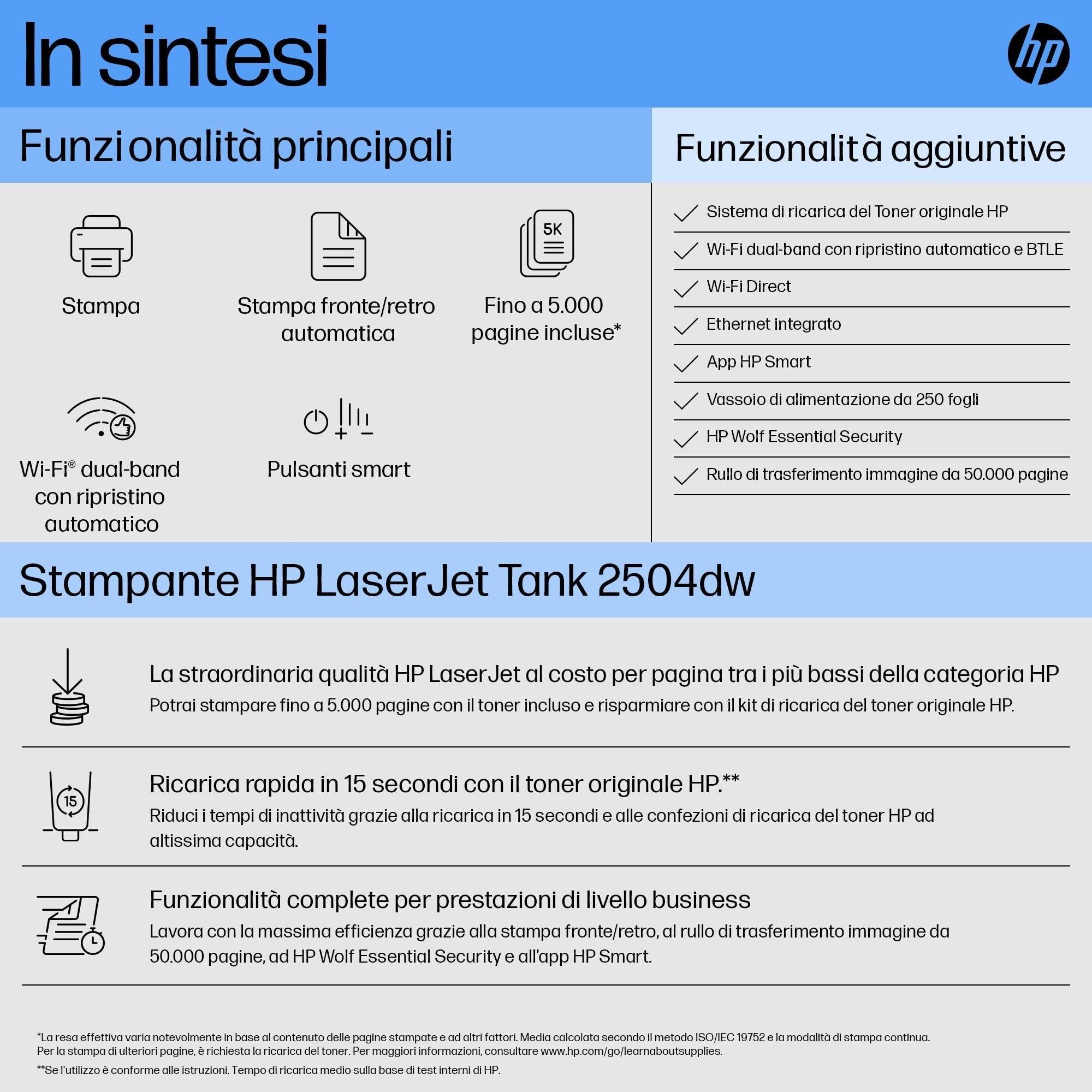 - Stampante HP LaserJet Tank 2504dw 2R7F4A con toner originale HP già preinstallato all’interno del serbatoio per stampare fino a 5000 pagine; velocità di stampa fino a 22 ppm nel formato A4
