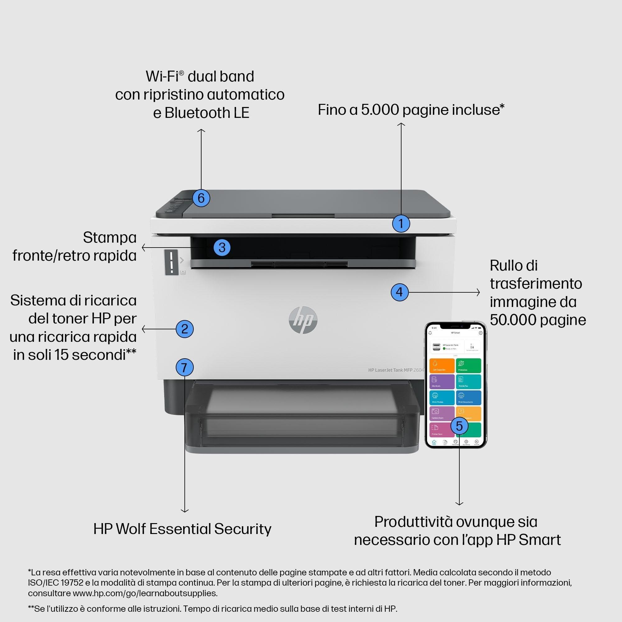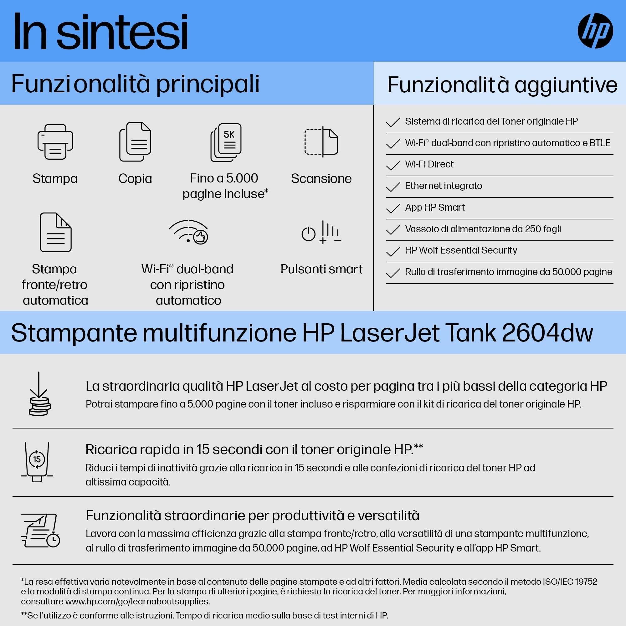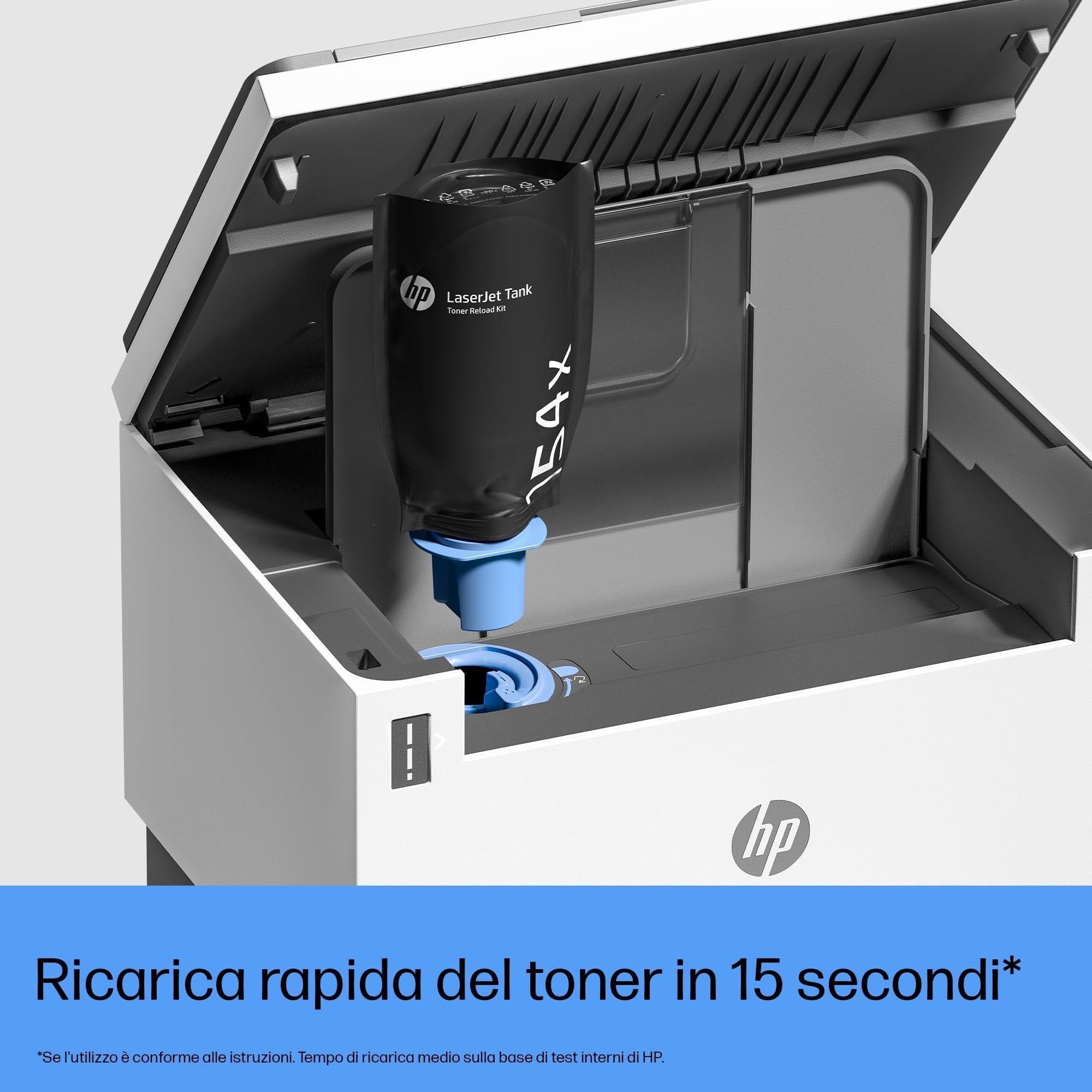 - Stampante HP Laser Tank 2604dw 381V0A con toner originale HP già preinstallato all’interno del serbatoio per stampare fino a 5000 pagine; velocità di stampa fino a 22 ppm nel formato A4