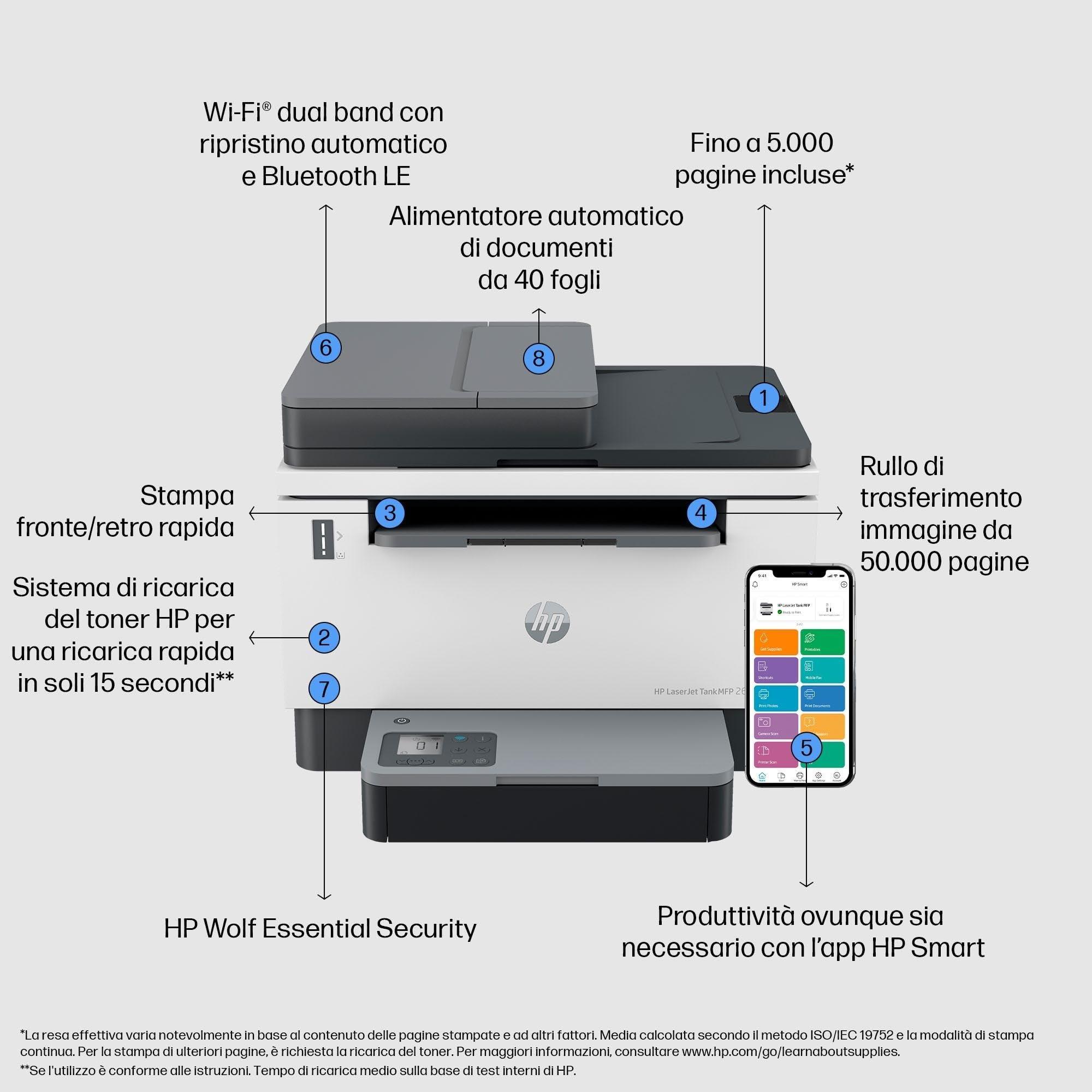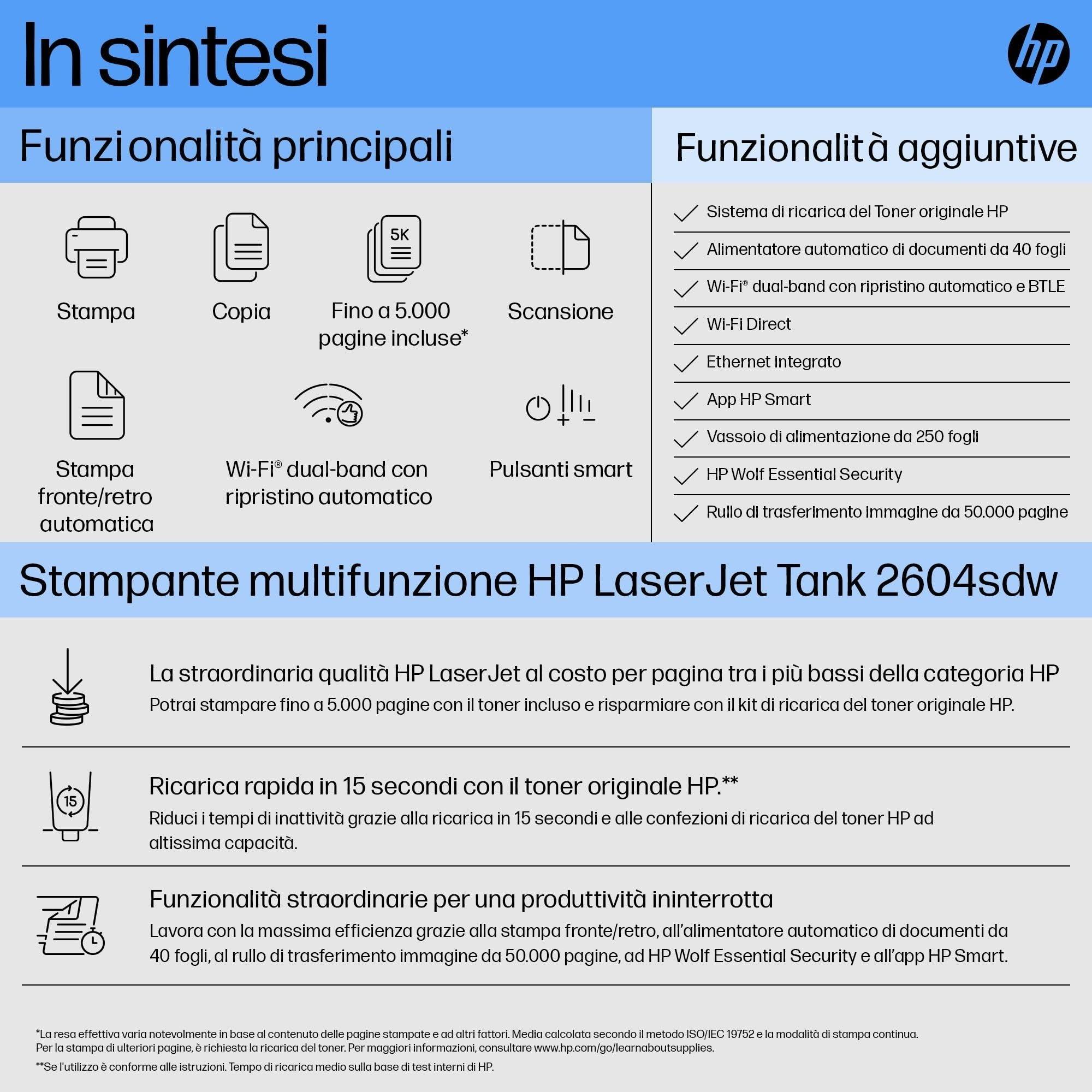 - Stampante HP LaserJet Tank 2604sdw 381V1A con toner HP già preinstallato all’interno del serbatoio per stampare fino a 5000 pagine; velocità di stampa fino a 22 ppm nel formato A4