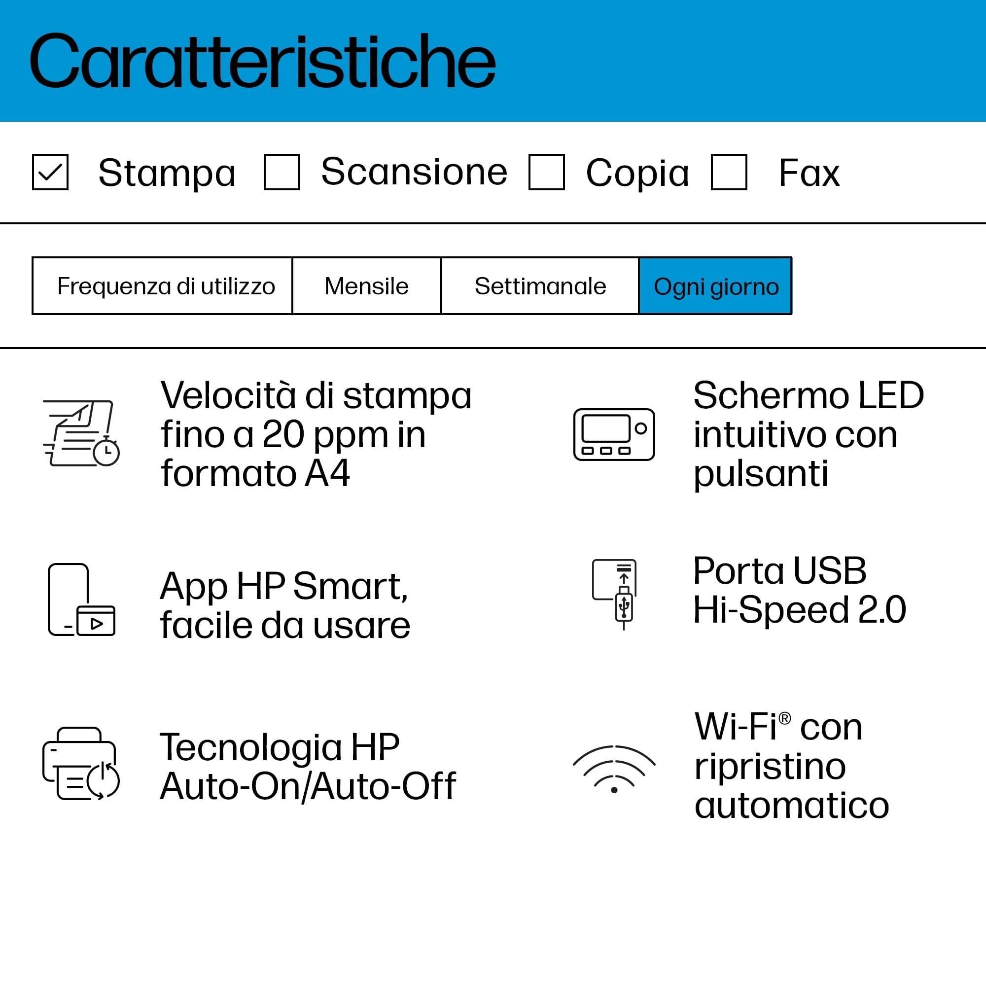 - CONNETTIVITA': è possibile stampare da pc, smartphone e tablet con l'app HP Smart che si connette ai dispositivi attraverso il Wireless Dual Band, Wi-Fi Direct, AirPrint e Mopria; Cavo USB non incluso