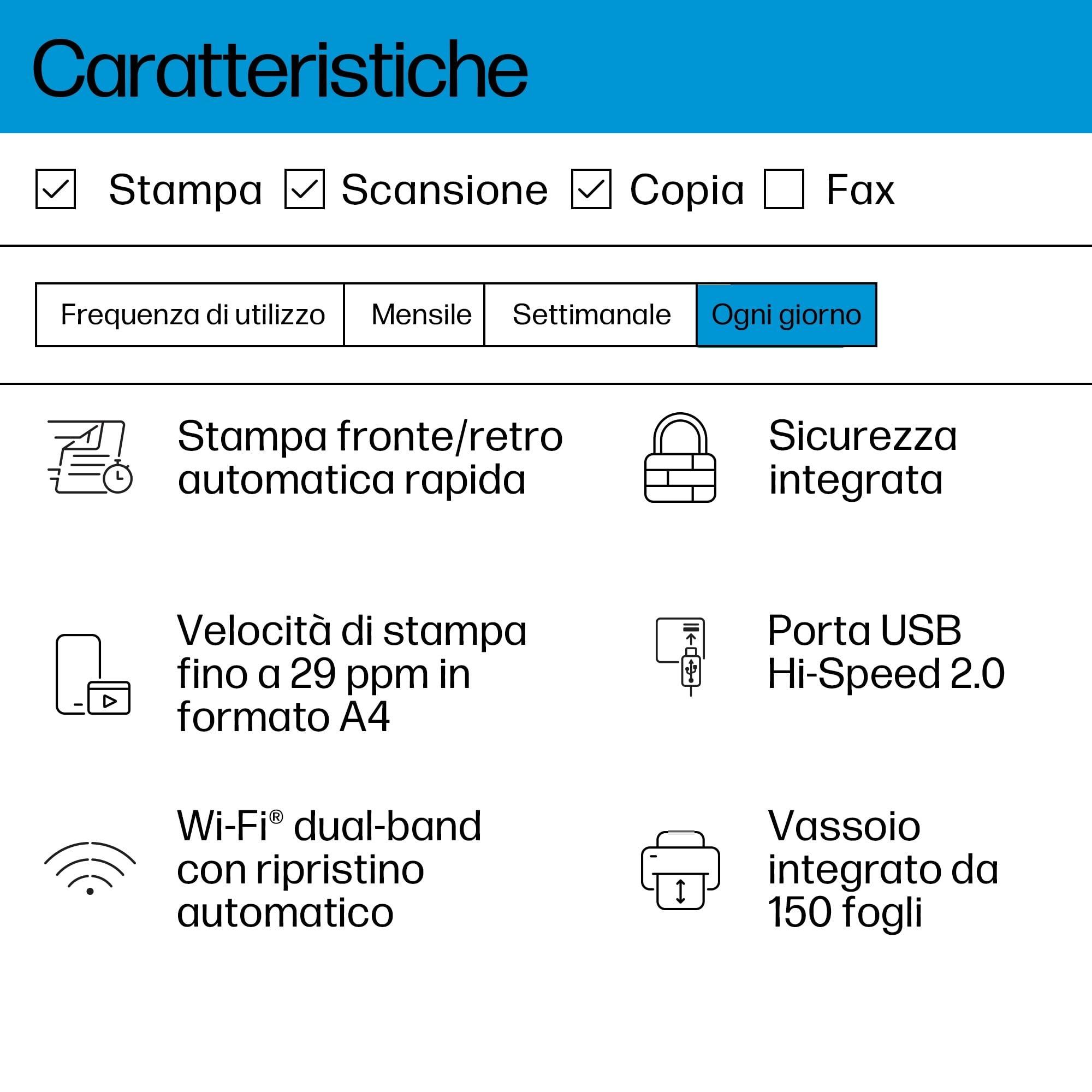 - CONNETTIVITA': è possibile stampare da pc, smartphone e tablet con l'app HP Smart che si connette ai dispositivi attraverso il Wireless Dual Band, Wi-Fi, Ethernet, AirPrint e Mopria; Cavo USB non incluso