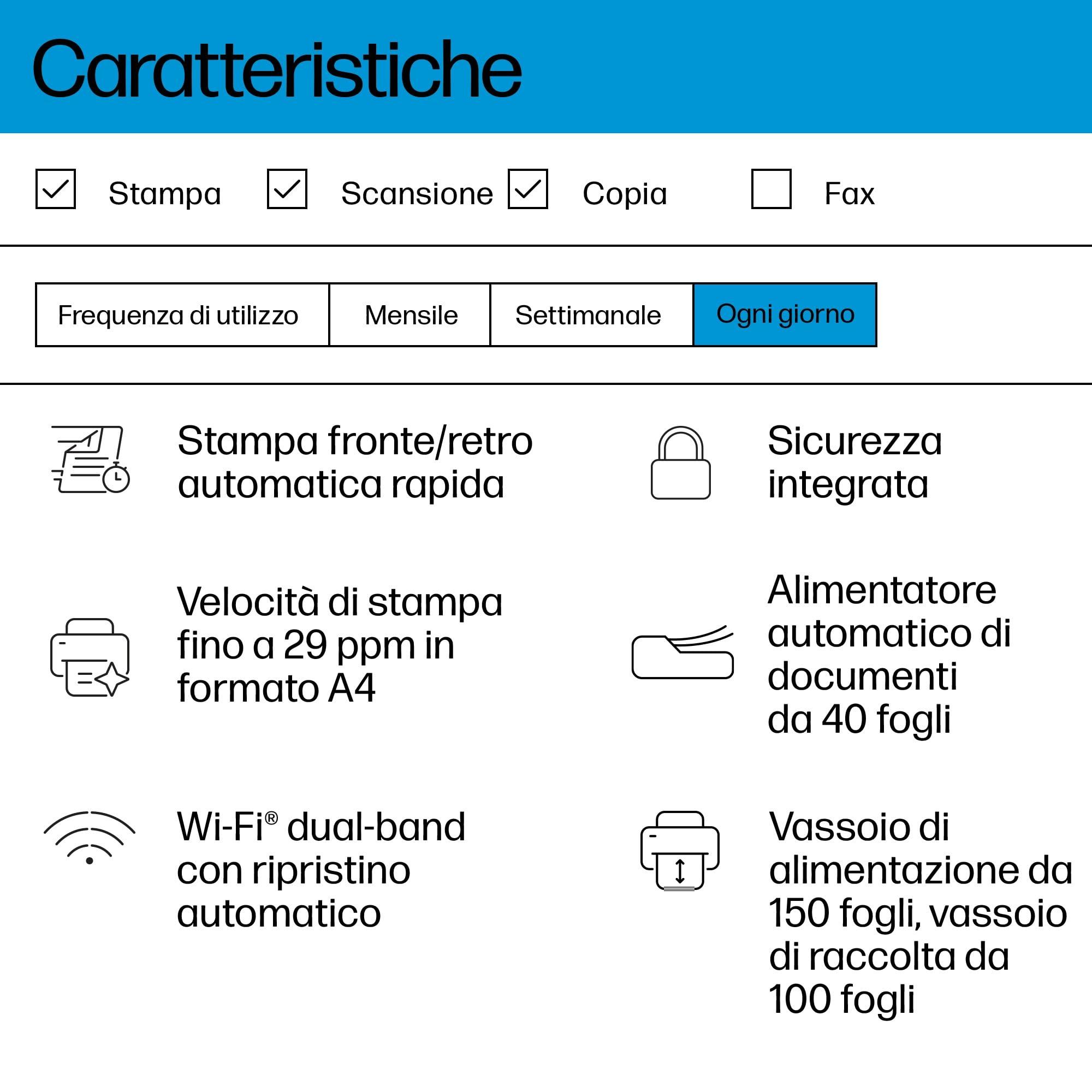- CONNETTIVITA': è possibile stampare da pc, smartphone e tablet con l'app HP Smart che si connette ai dispositivi attraverso il Wireless Dual Band, Wi-Fi, Ethernet, AirPrint e Mopria; Cavo USB non incluso