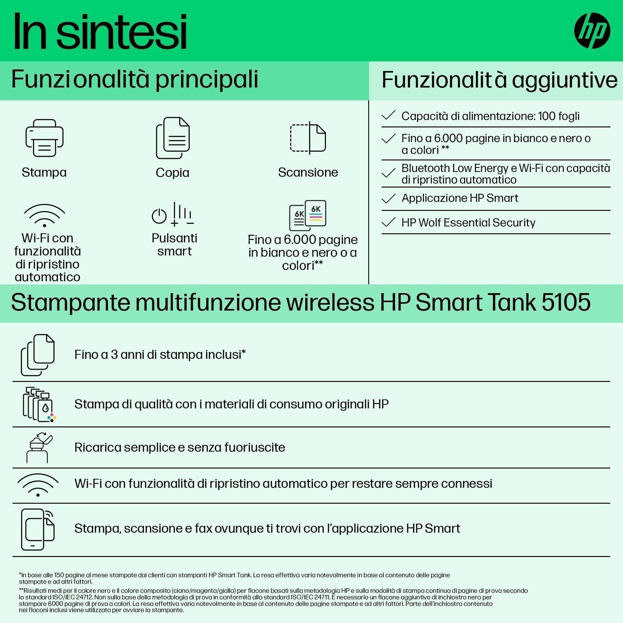 HP Smart Tank 5105 1F3Y3A, Stampante Multifunzione A4 con serbatoio di inchiostro ad alto volume di stampa, stampa fronte/retro manuale, scansione, copia, 22 ppm, USB, Wi-Fi, HP Smart, Bianca